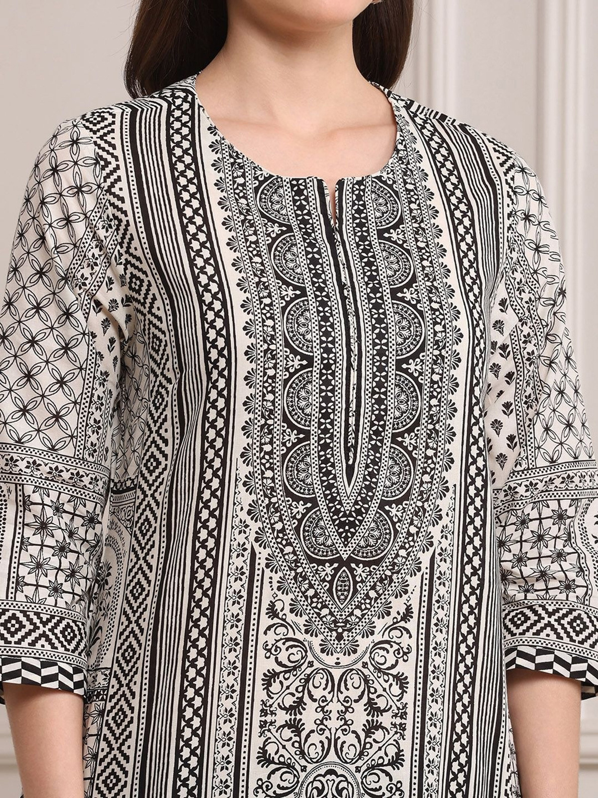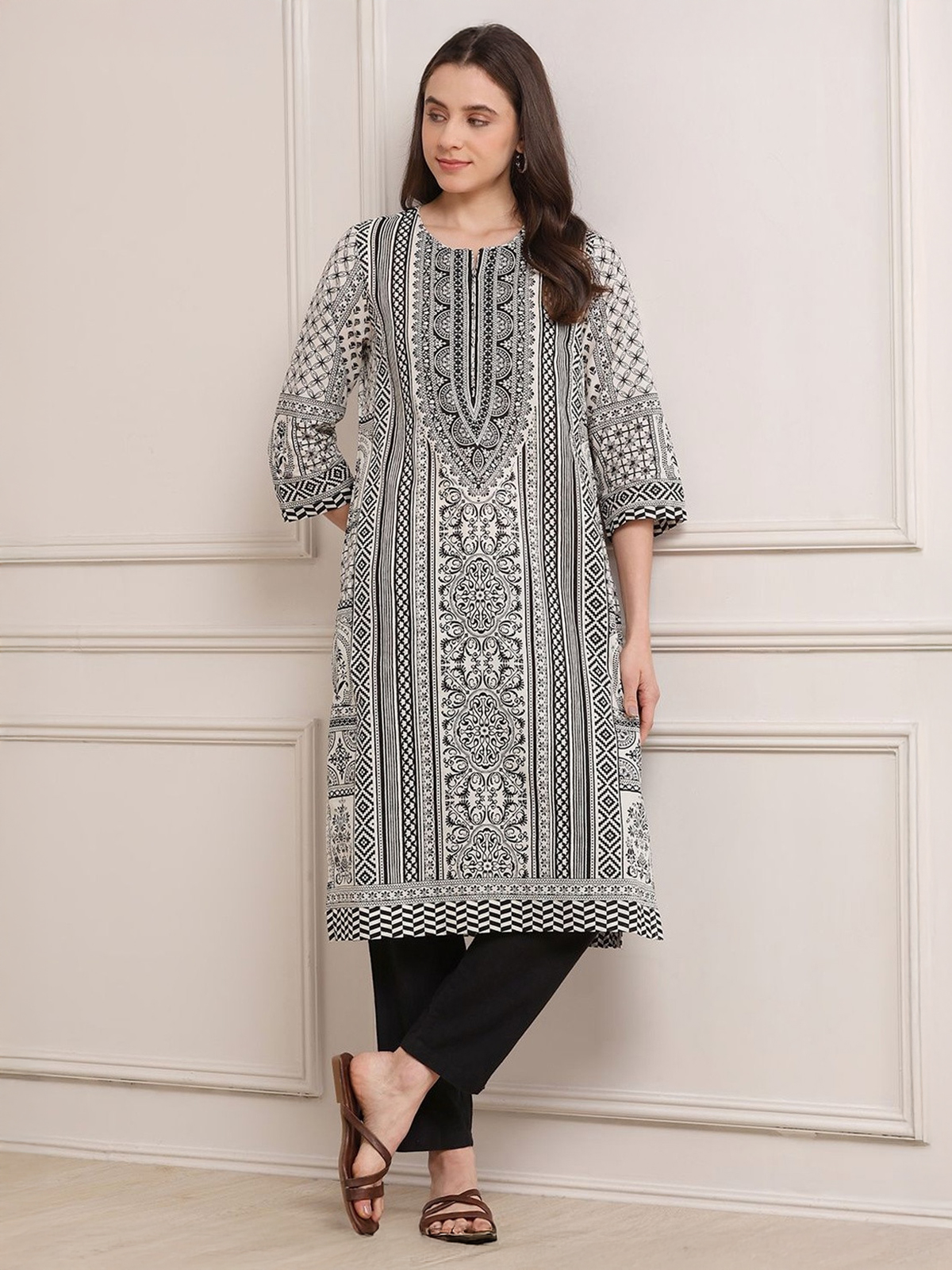 This black and white printed straight cut kurti is made from smooth cotton silk fabric, offering comfort and style. Featuring quarter sleeves and a minimal design, it is perfect for casual wear, daily use, and pairing with pants or palazzos.