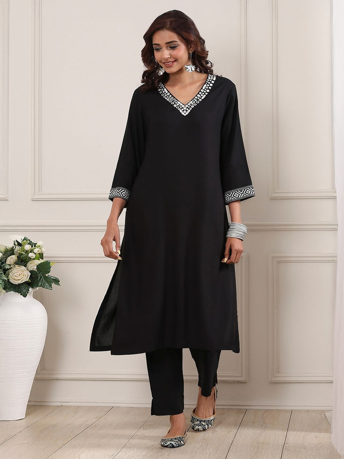 This black cotton silk kurti features elegant aabla work that adds traditional charm to casual wear. Designed with a V-neck and quarter sleeves, it offers a unique blend of comfort and style for everyday occasions.