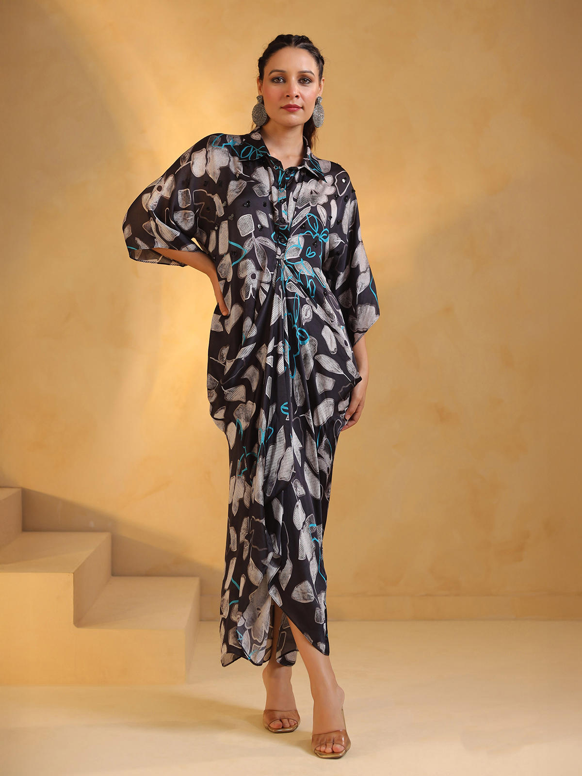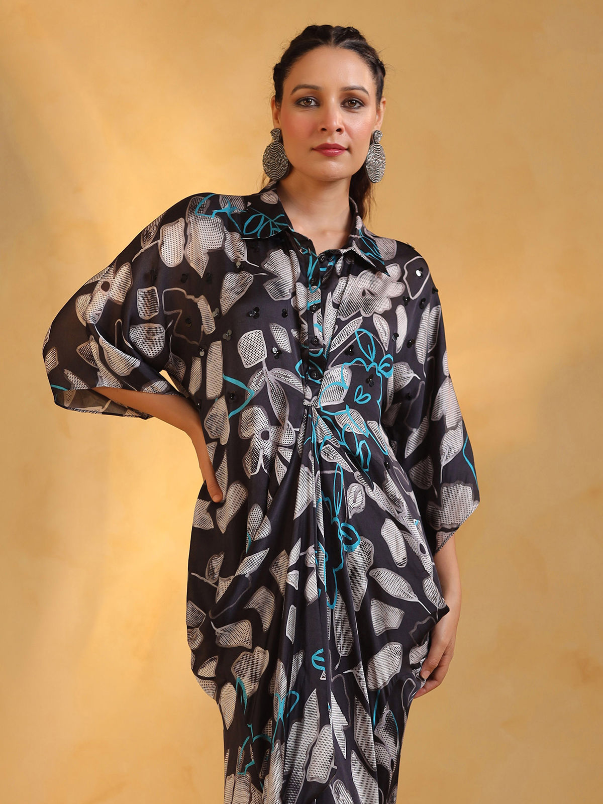 Striking in black silk, this printed kurti is adorned with sequins and cutdana for glamorous festive flair. The smart collar with quarter sleeves adds a touch of sophistication, making it an ideal choice for evening occasions and traditional celebrations alike.