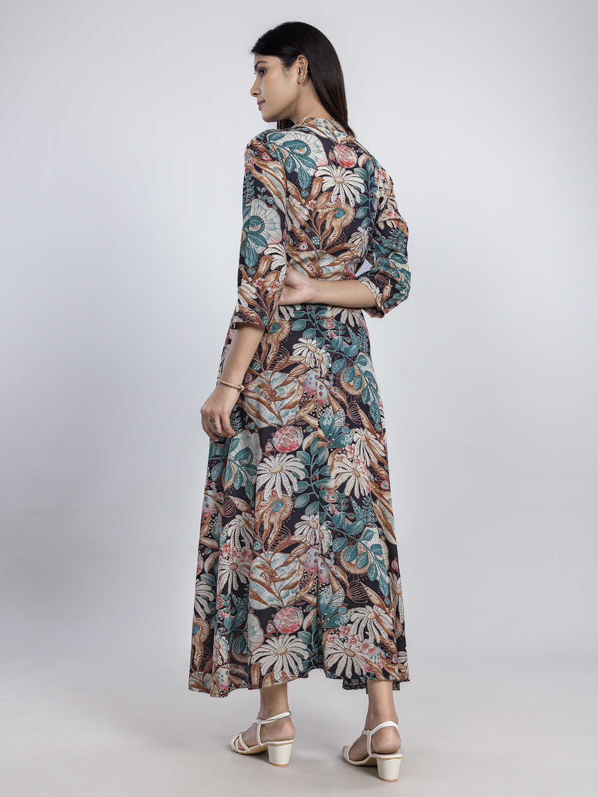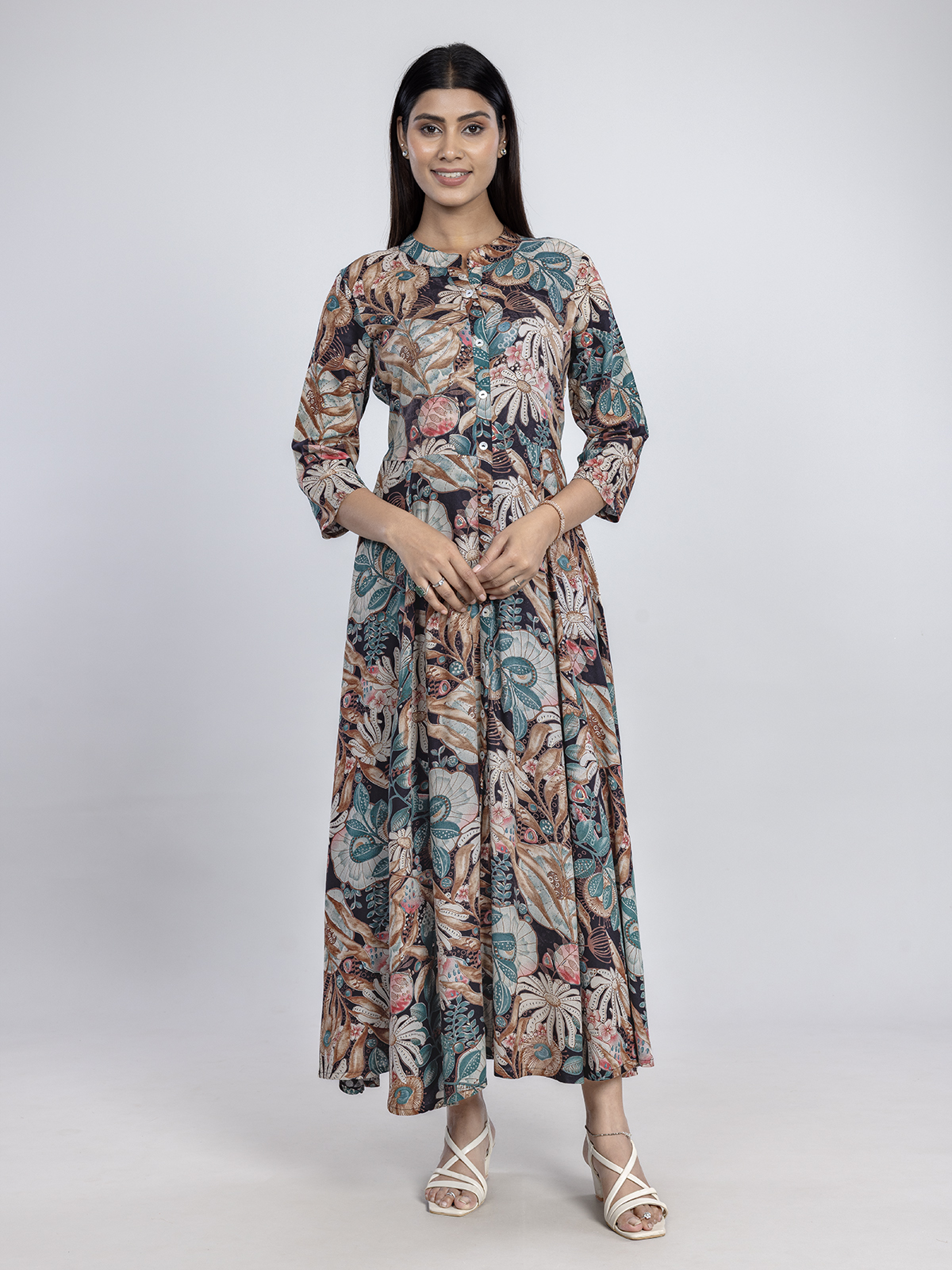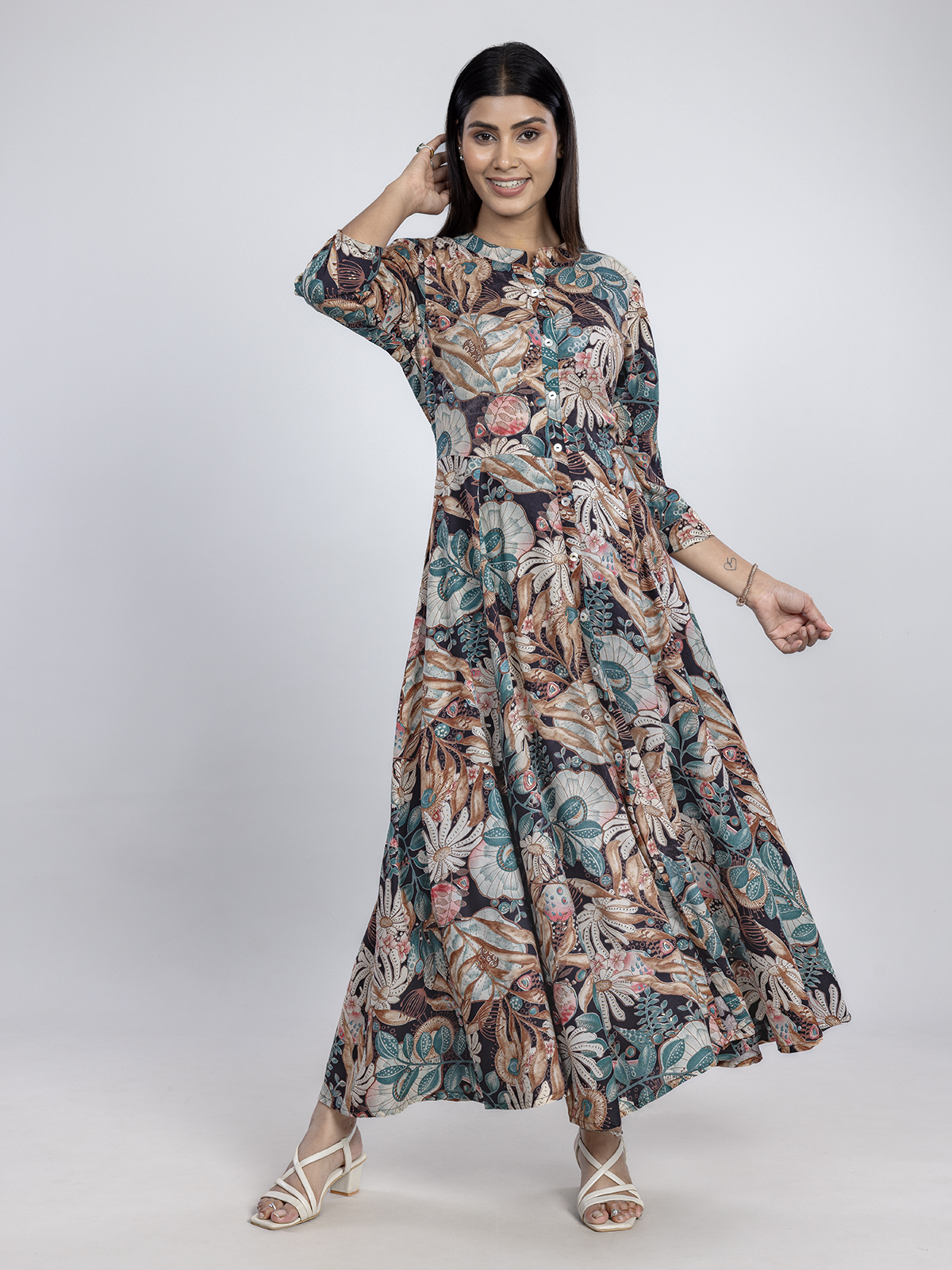 This black cotton silk printed kurti with a stand collar and quarter sleeves offers cheerful elegance. Its long style and breezy fabric make it a perfect pick for casual days or light festive moments.