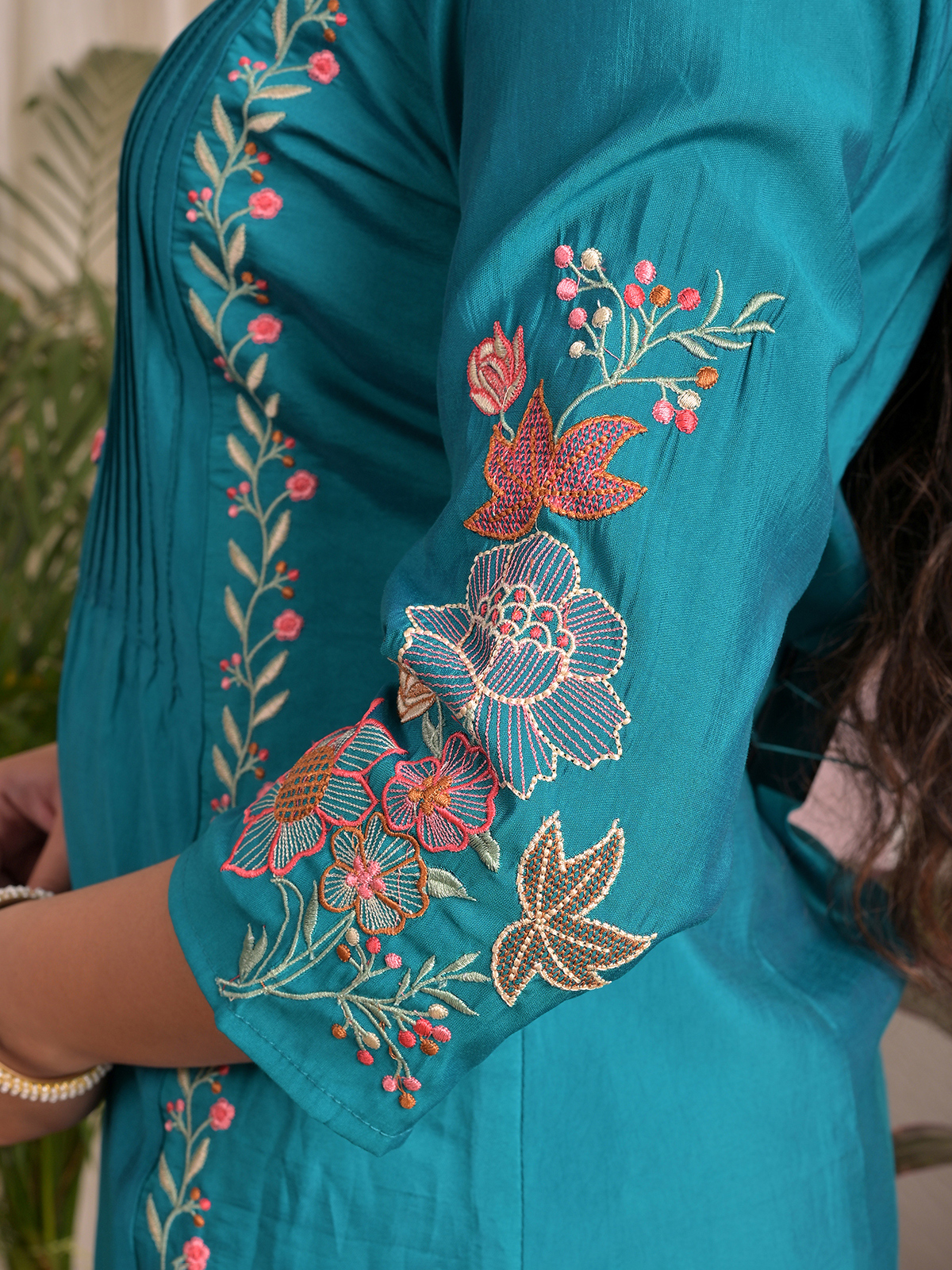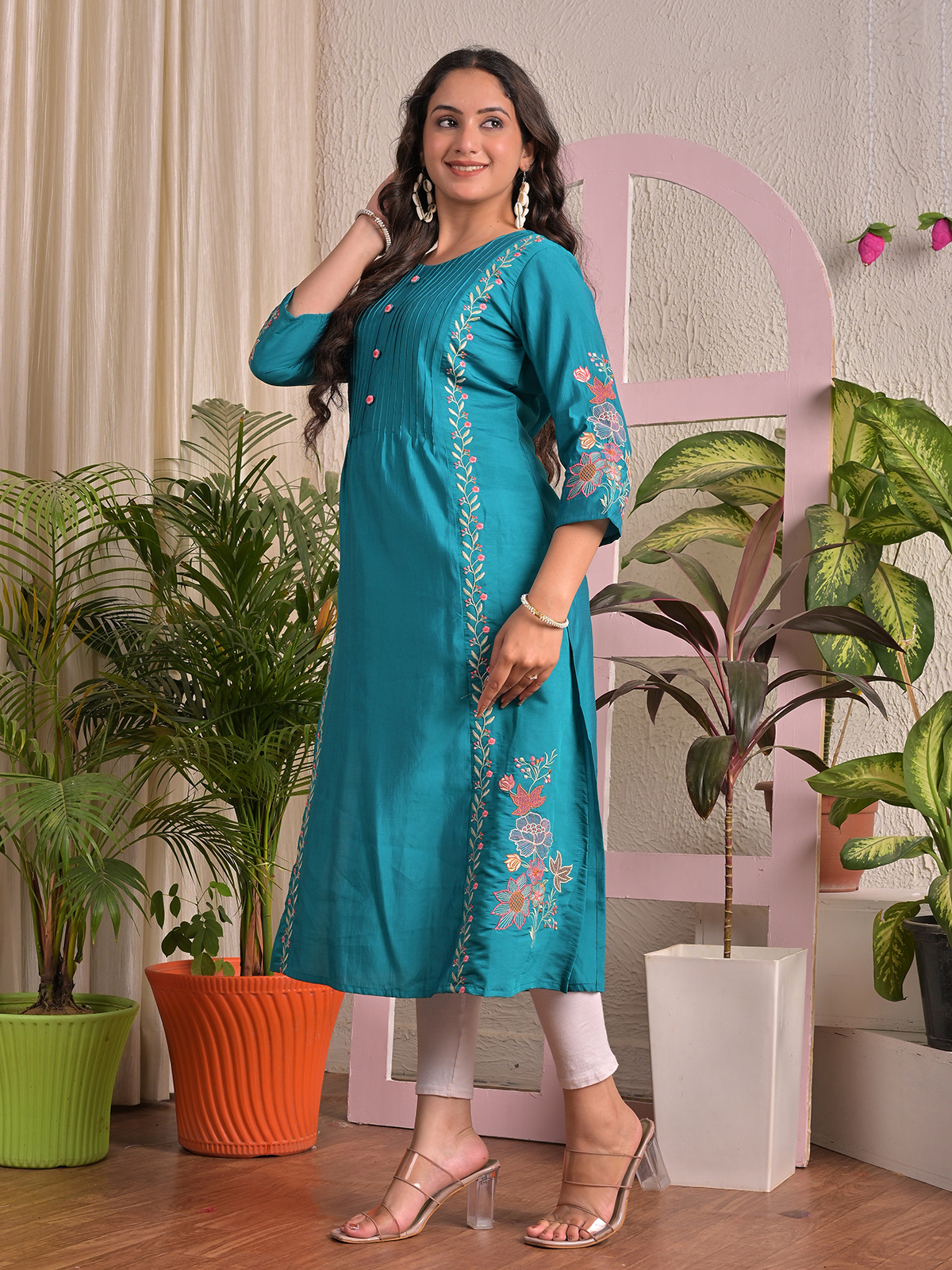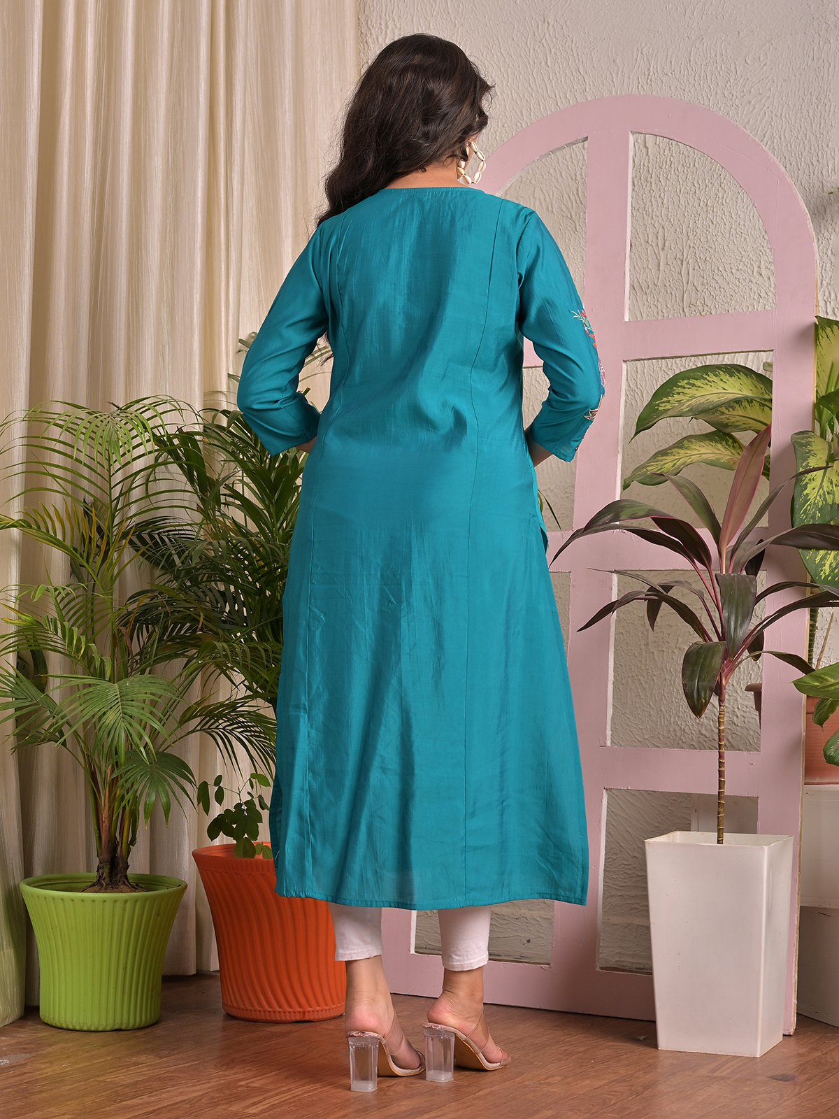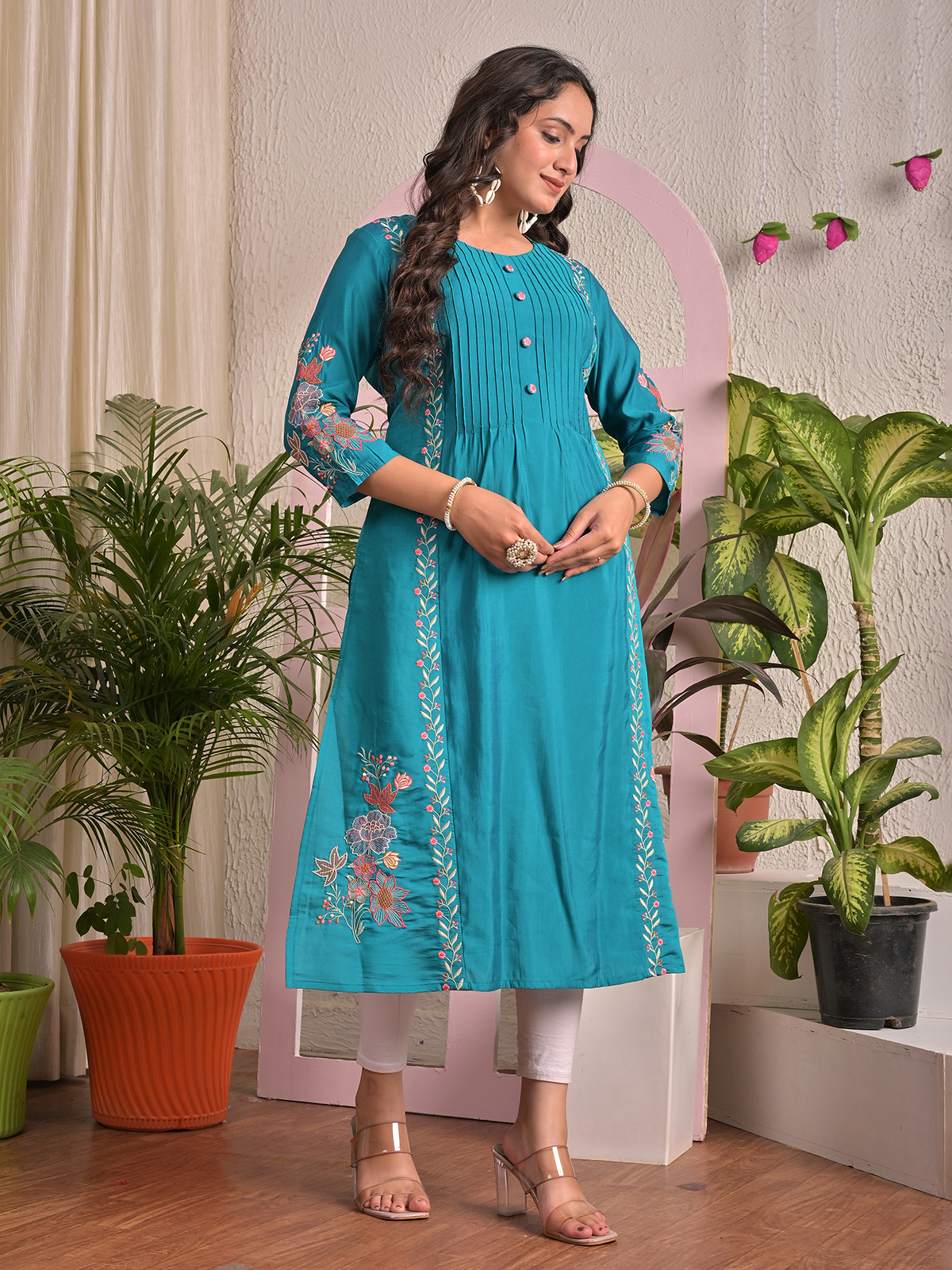 Experience effortless style with this blue silk kurti featuring delicate embroidery for subtle ethnic appeal. Designed with a round neck and quarter sleeves, it combines lightweight comfort with elegant detailing. Perfect for casual day wear or semi-festive occasions, this kurti is versatile, graceful, and easy to pair with leggings or palazzo pants.