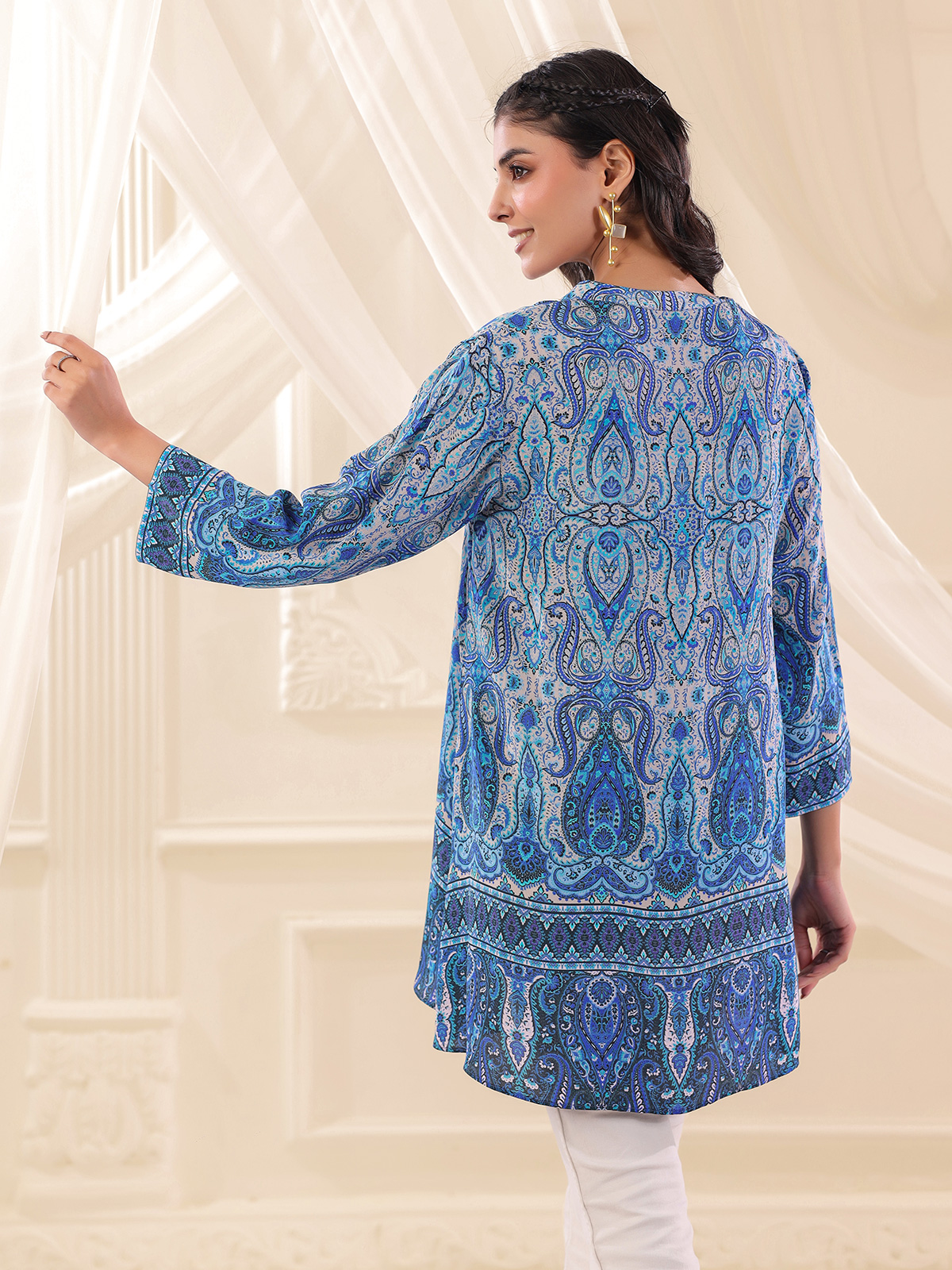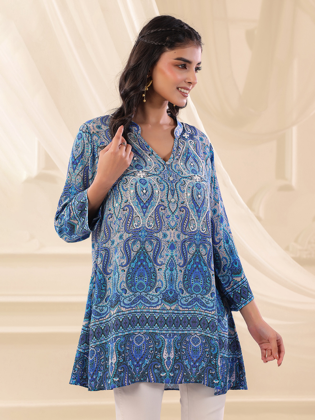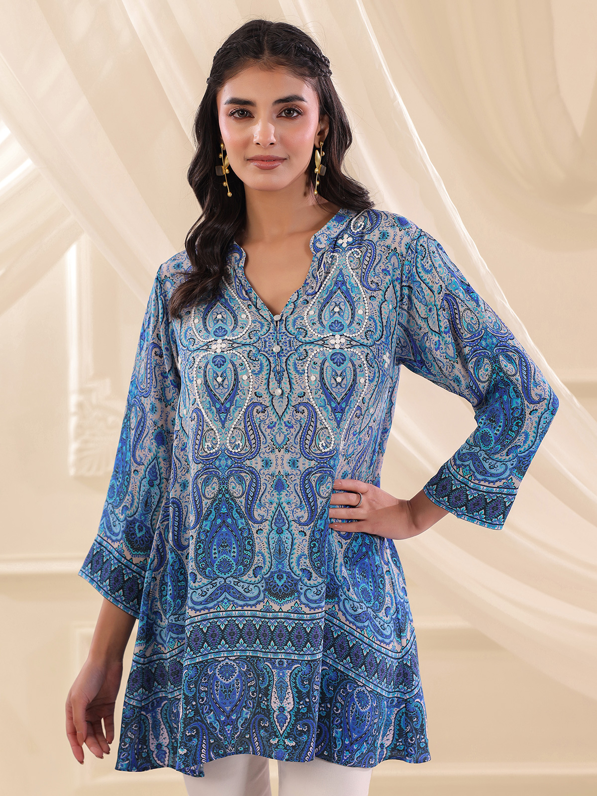 Elegant blue tones highlight the charm of this viscose crepe printed short kurti crafted for relaxed everyday style. Designed with a classic collar neckline and comfortable quarter sleeves. The kurti is enhanced with delicate bead embellishments that add subtle decorative appeal. The lightweight fabric and graceful silhouette make it a stylish choice for casual outings and daytime occasions.