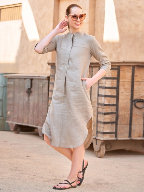 The beige cotton plain kurti is an elegant choice for casual occasions from BOOM. It features a stand collar neck and quarter sleeves.
