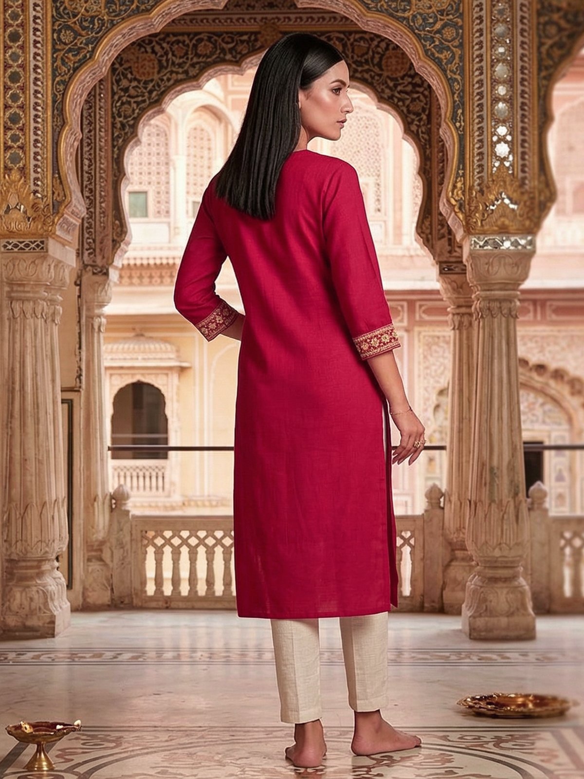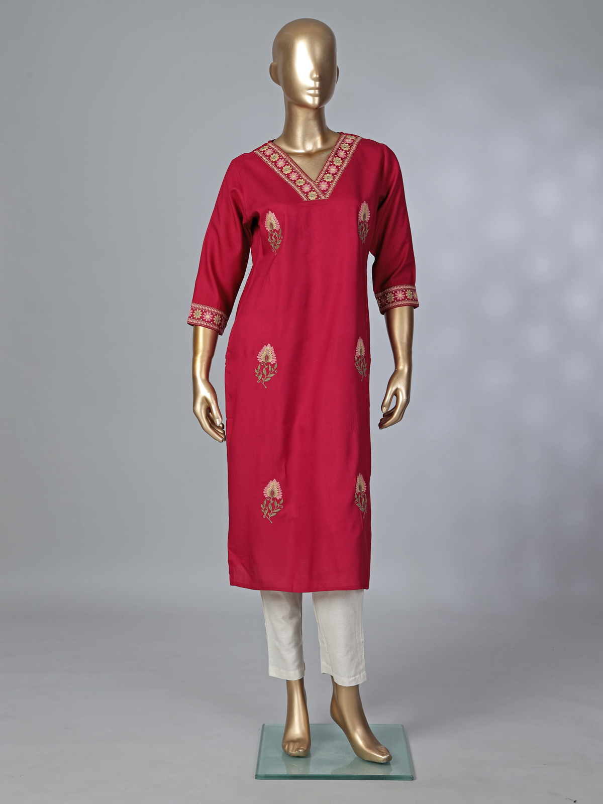 Warm maroon tones elevate this cotton silk kurti with a rich, festive touch. Detailed with intricate embroidery, it reflects subtle traditional beauty. Styled with a V neckline and quarter sleeves, it ensures a comfortable and elegant silhouette, perfect for casual gatherings and everyday ethnic wear.