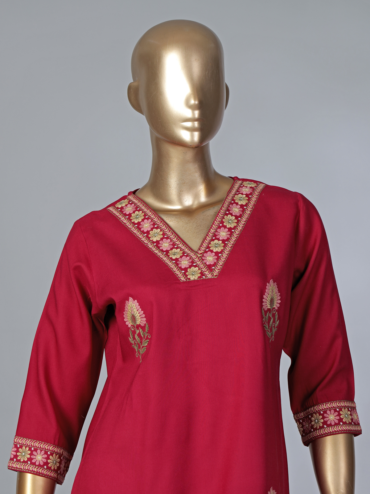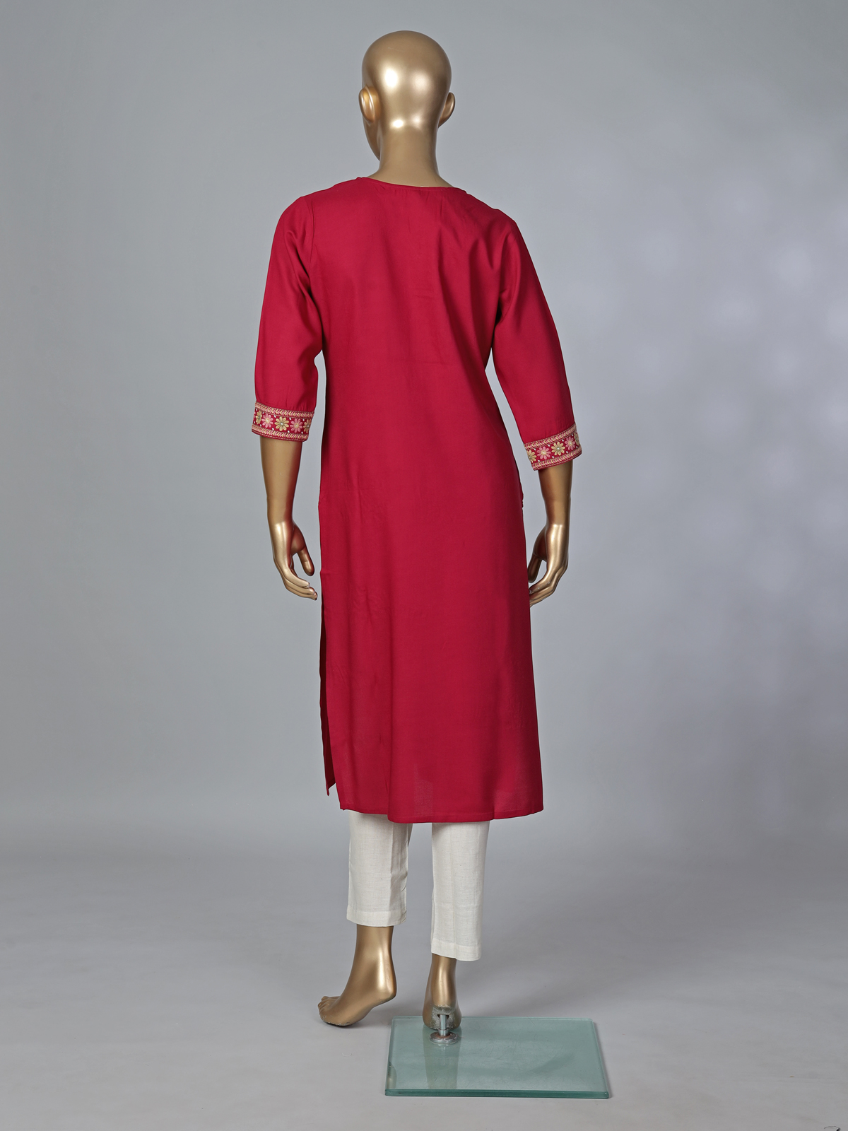 Bright Maroon Cotton Silk Embroidered Casual Kurti