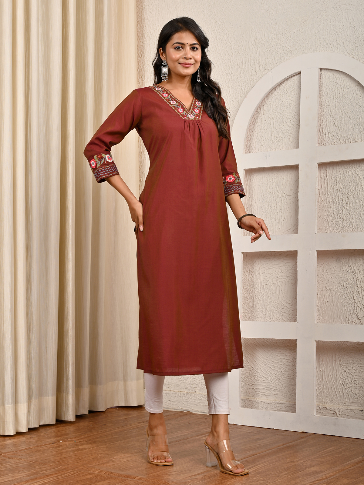 Chic and comfortable, this brown cotton silk kurti is detailed with fine embroidery. Designed with a V neckline and quarter sleeves, it lends earthy elegance and timeless appeal to your everyday wardrobe with a hint of festive charm.