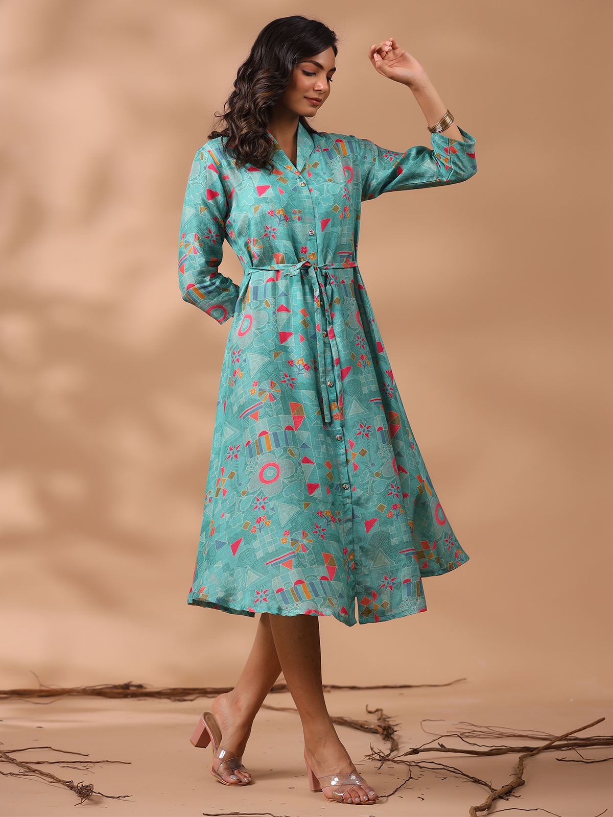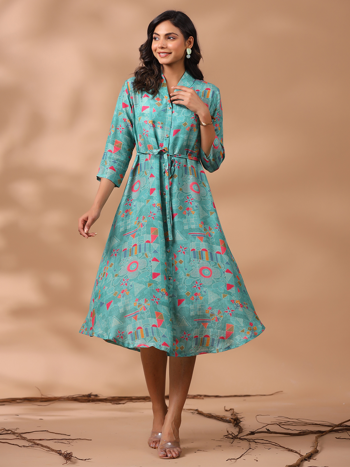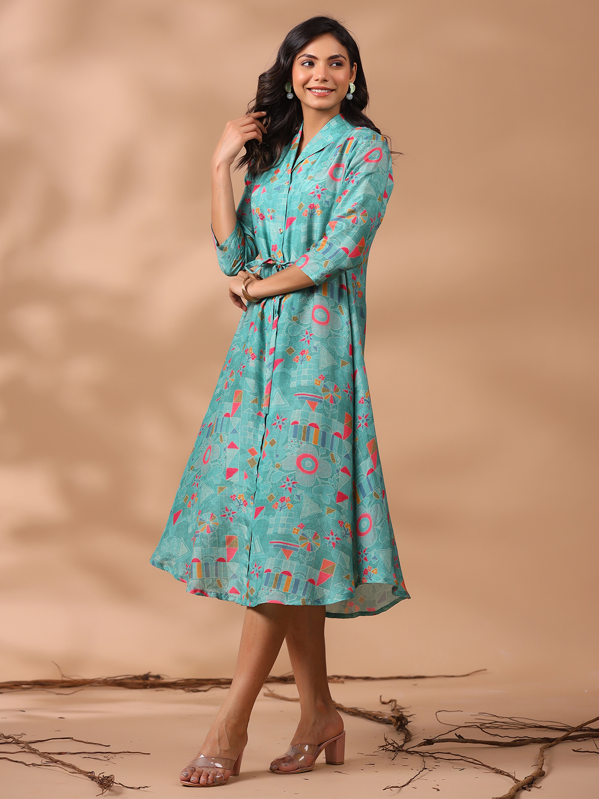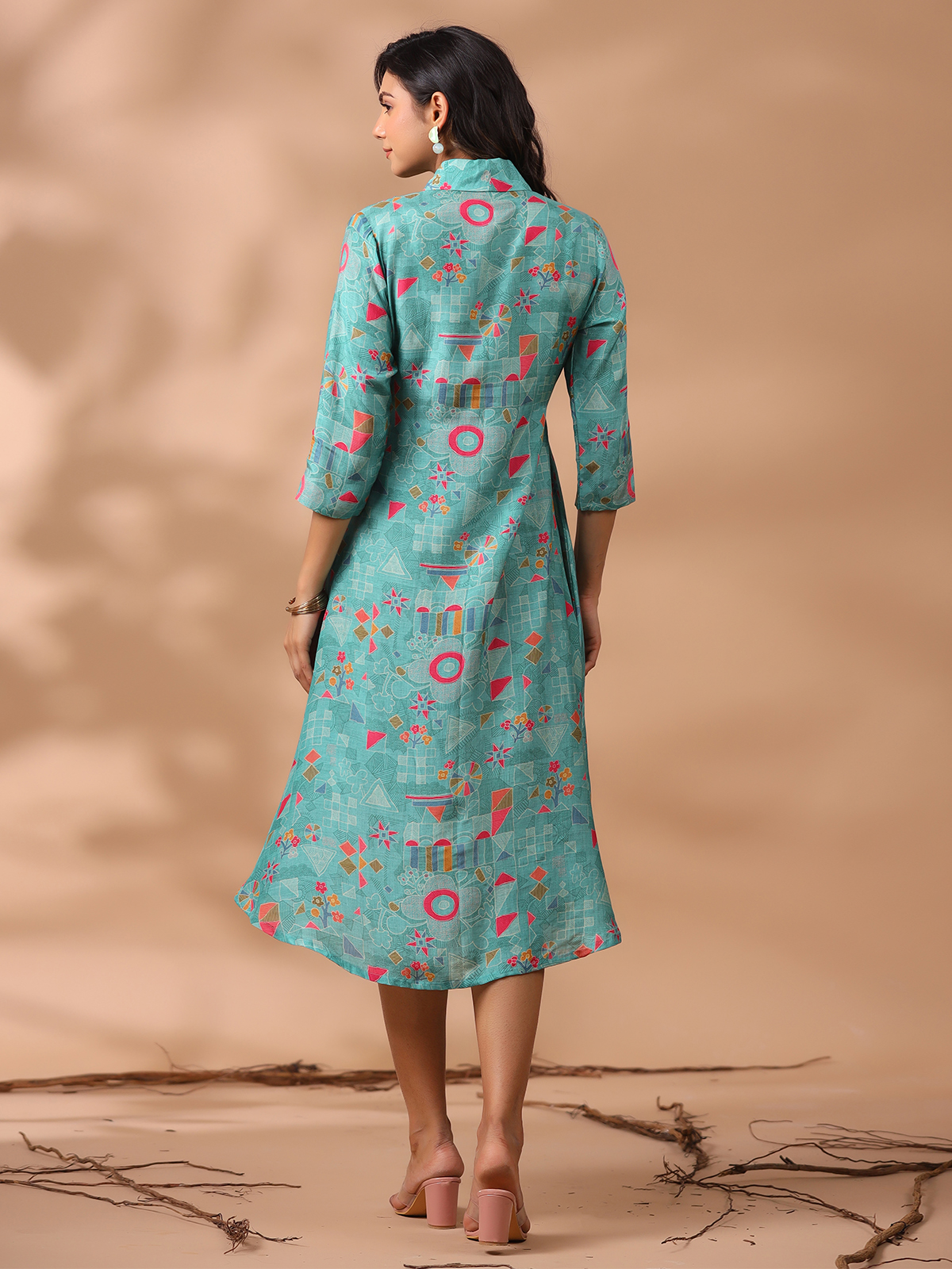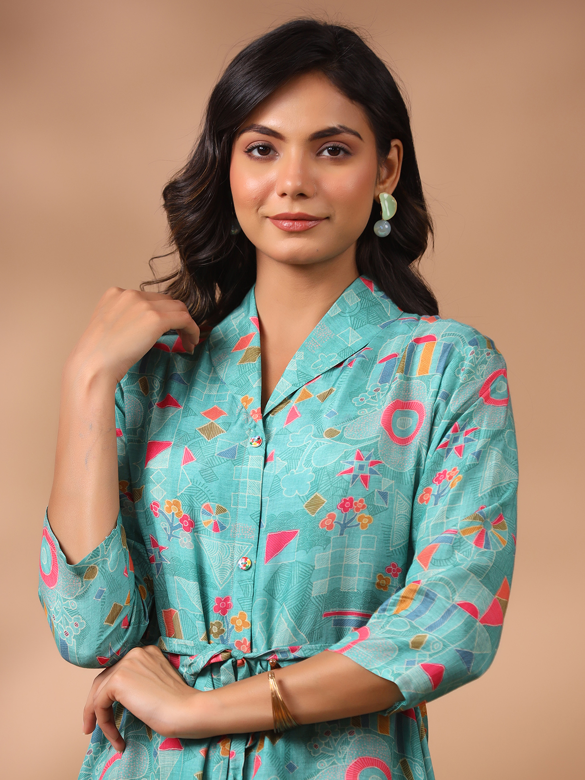 This aqua cotton printed kurti is suitable for casual wear. The collar neck and quarter sleeves offer a contemporary touch.
