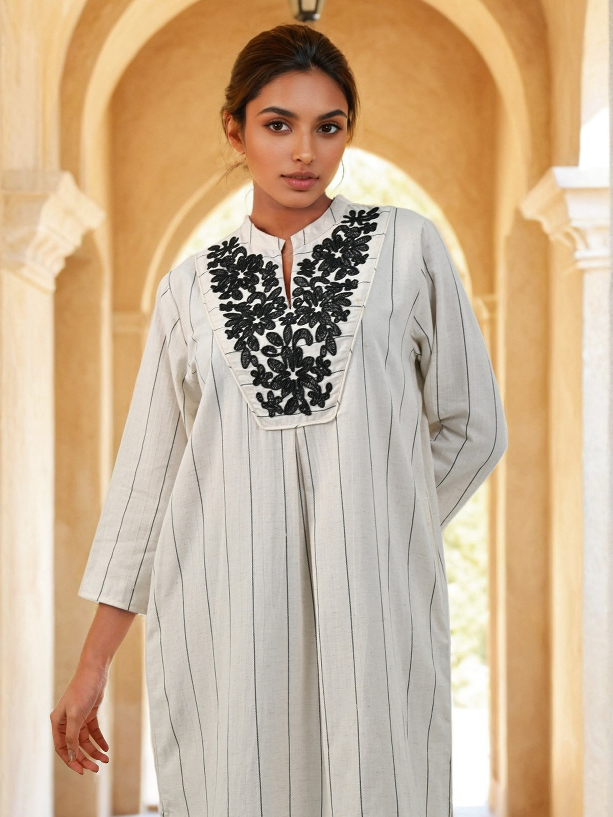 The white cotton kurti, decorated with striped motifs and intricate thread embroidery, is perfect for festive occasions. Its stand collar and three-quarter sleeves strike a graceful and comfortable balance.