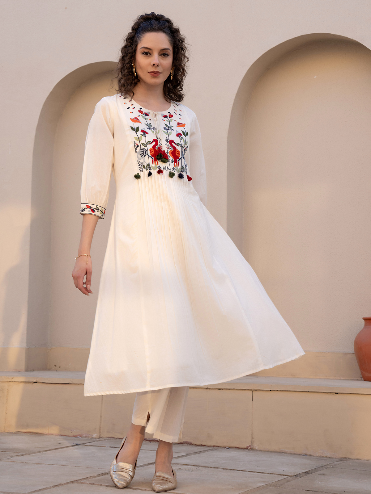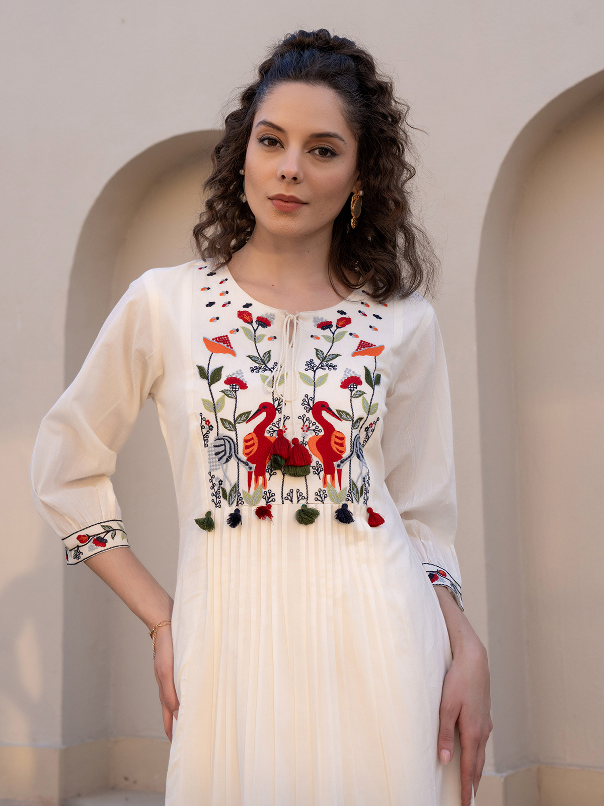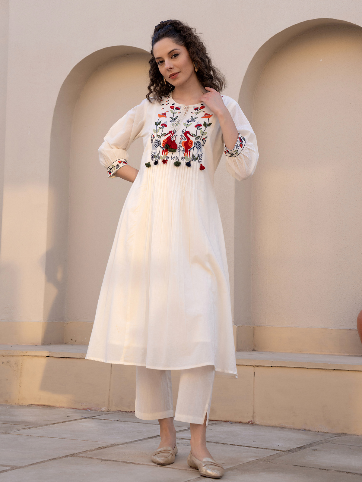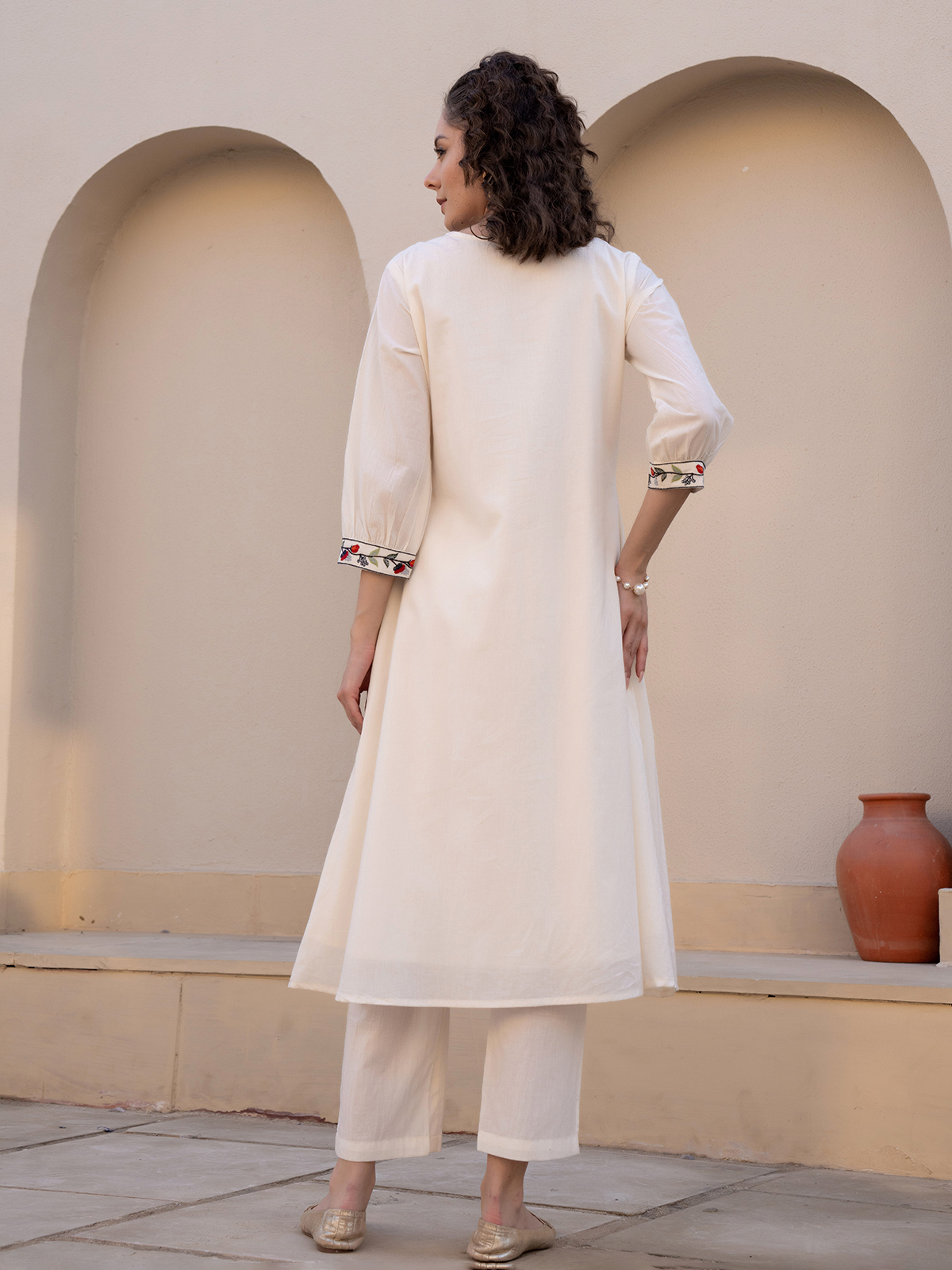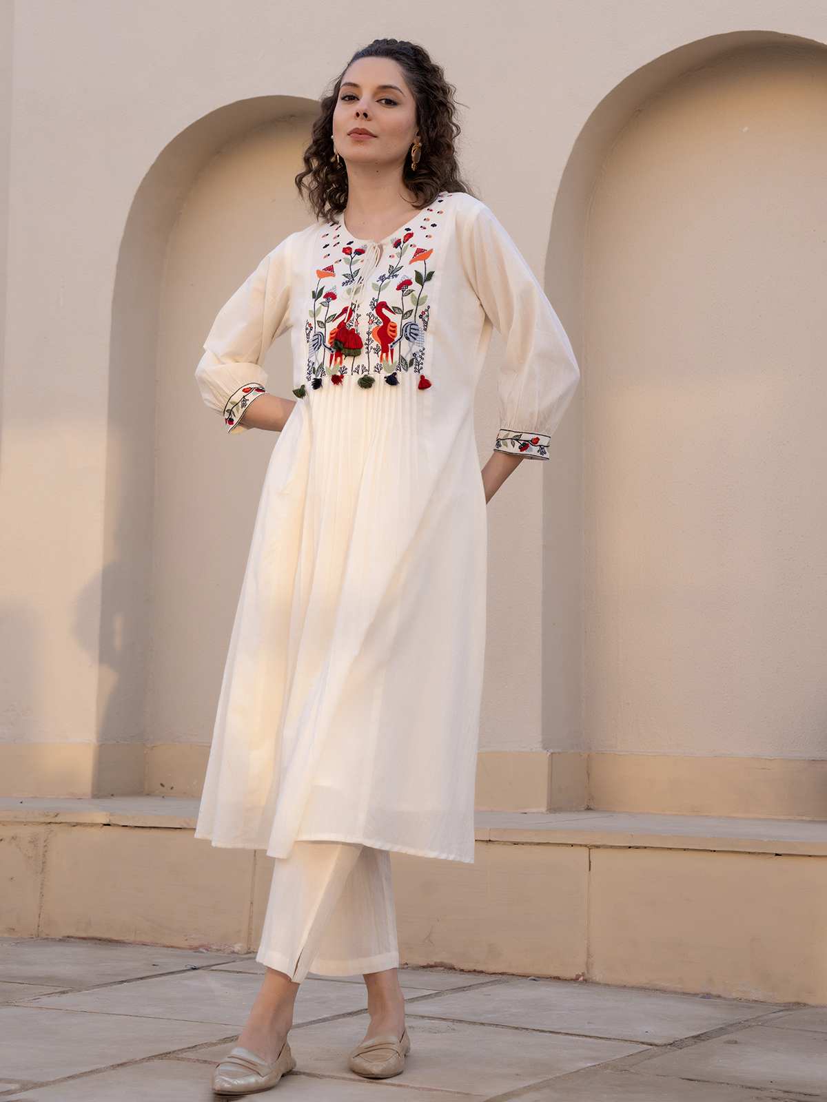 A blend of elegance and ease, this cream cotton silk kurti showcases yoke embroidery with a keyhole neckline and quarter sleeves. Its graceful detailing makes it a versatile casual outfit, offering both comfort and refined style for daily use.