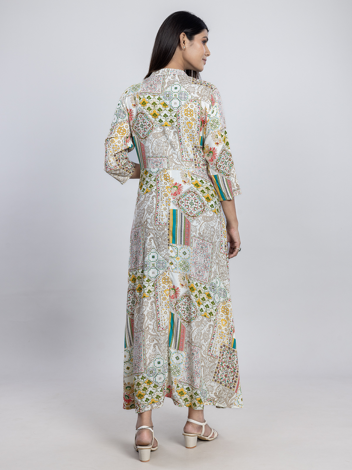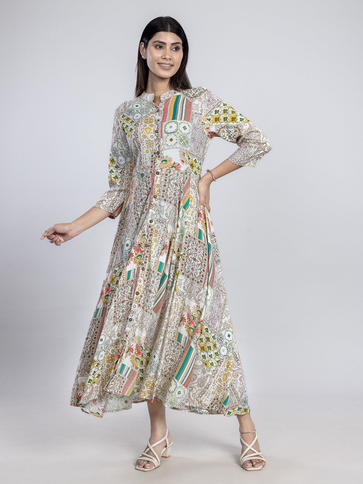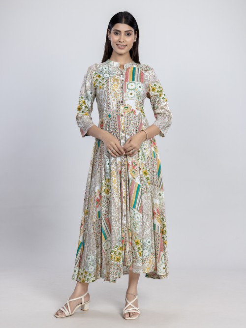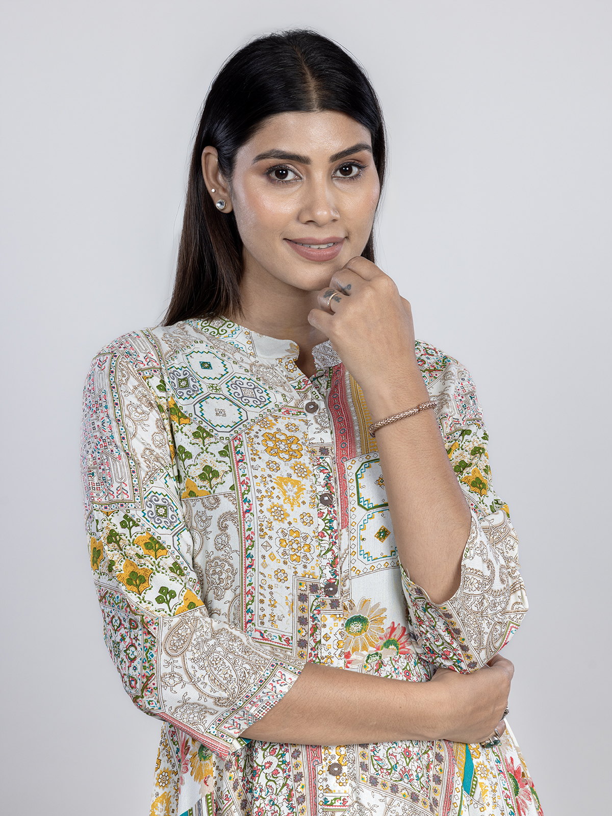 This cream cotton printed kurti styled with a stand collar and quarter sleeves is understated yet elegant. The soft tone makes it versatile for office or casual settings, offering relaxed comfort throughout the day.