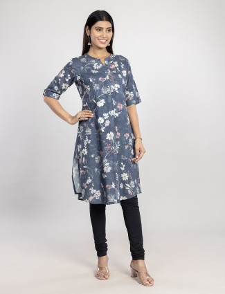 Designed in dark beige linen, this printed kurti with a stand collar and elbow sleeves exudes calm elegance. Lightweight and easy to style, it brings together comfort and simplicity, perfect for casual outings or relaxed everyday wear.