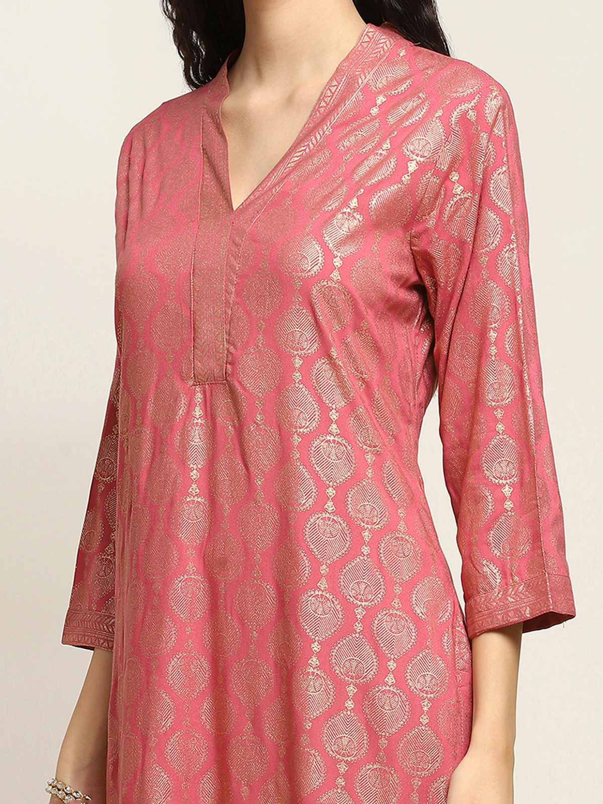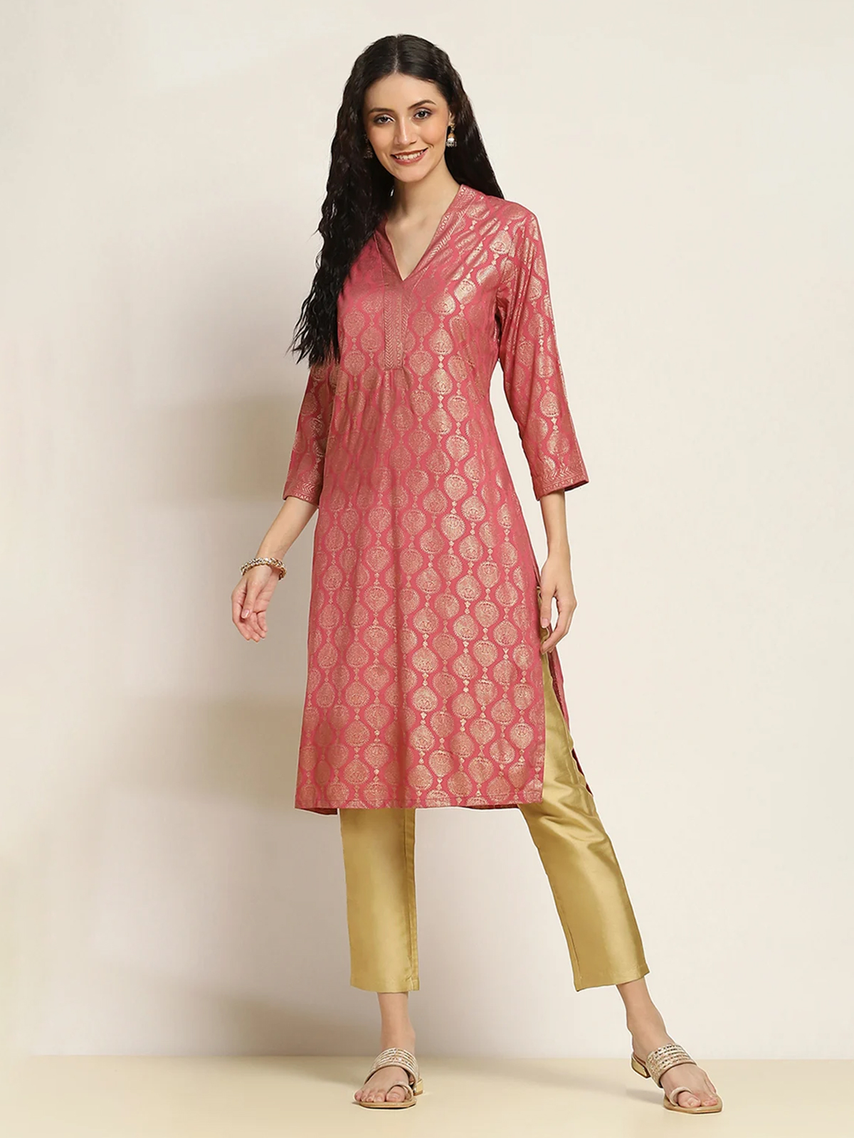 Step into casual elegance with this dark peach cotton silk kurti. Highlighted by golden print and styled with a V neckline and quarter sleeves, it creates a flattering silhouette. Ideal for day wear, it adds vibrance to your look while keeping you comfortable and stylish.