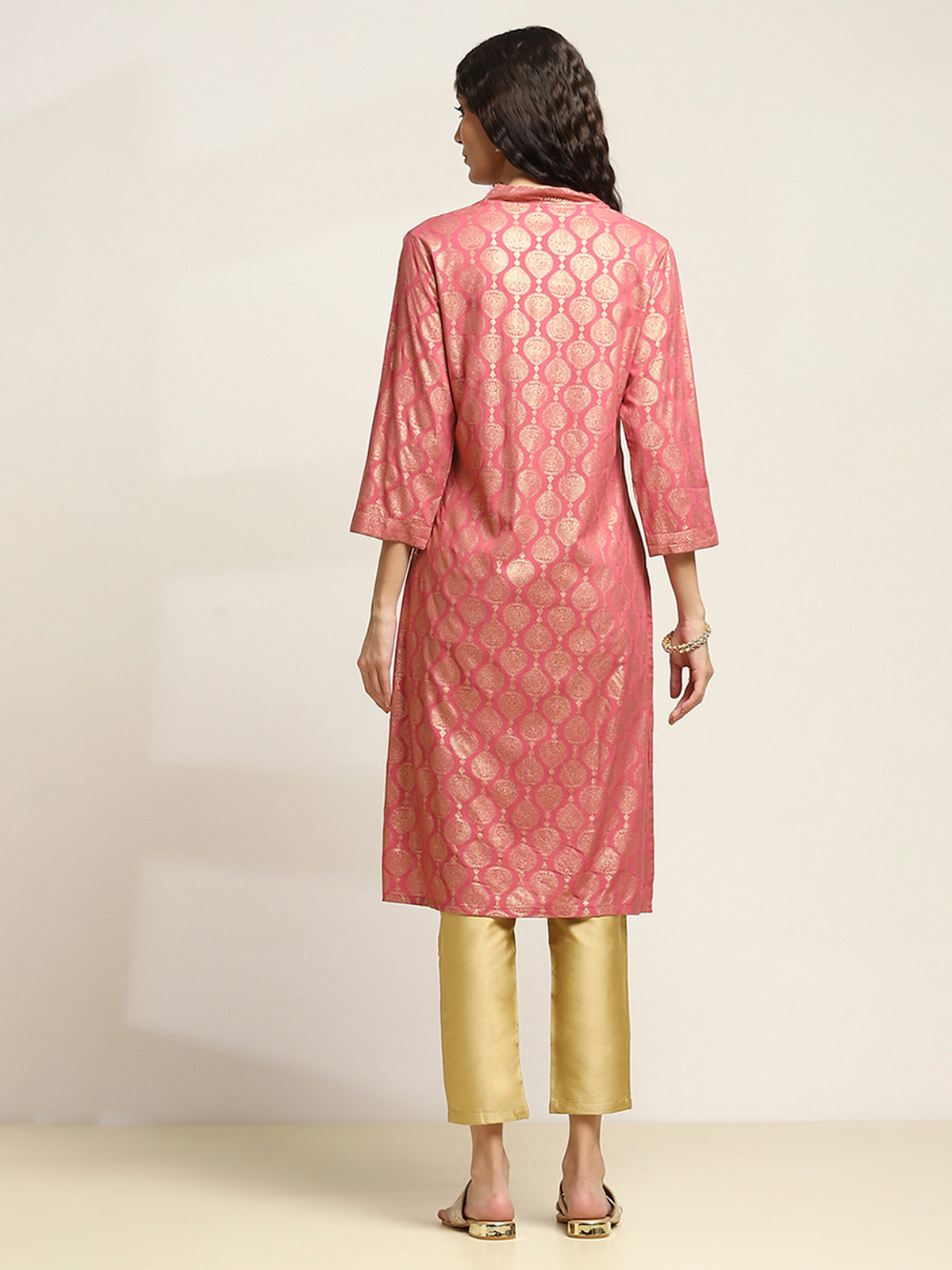 Dark Peach Cotton Silk Kurti With Golden Print Accents