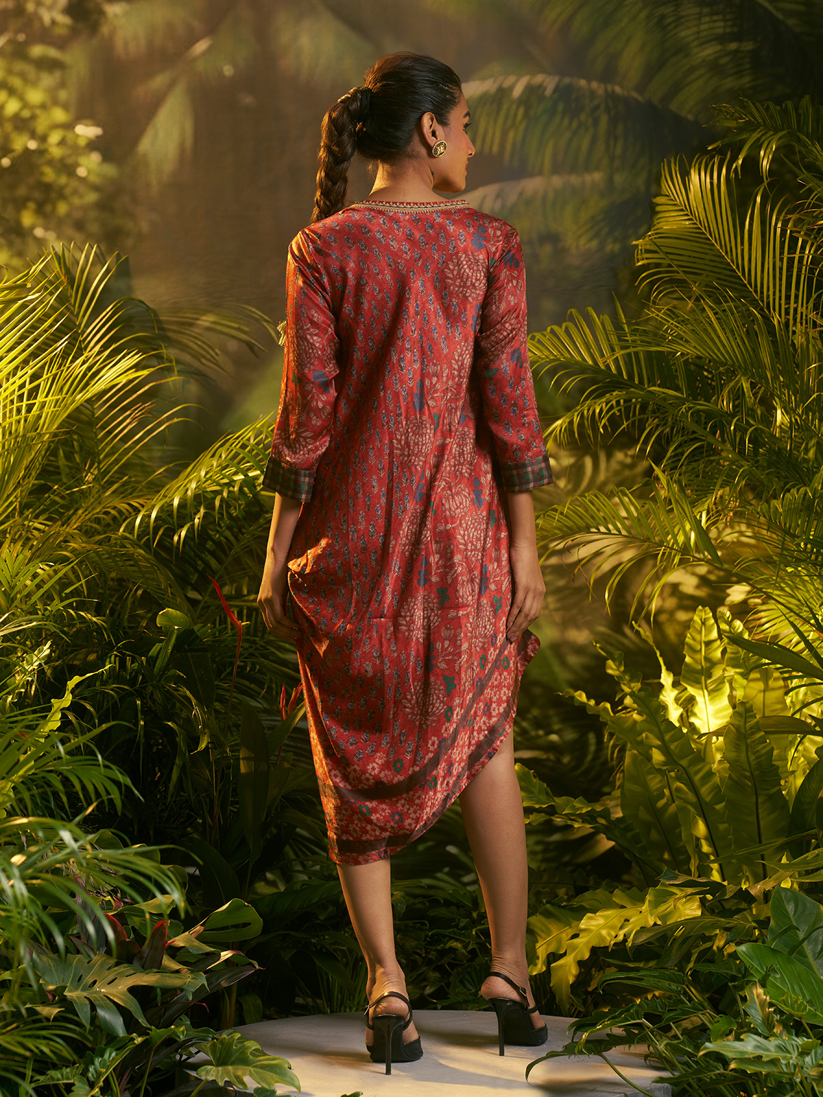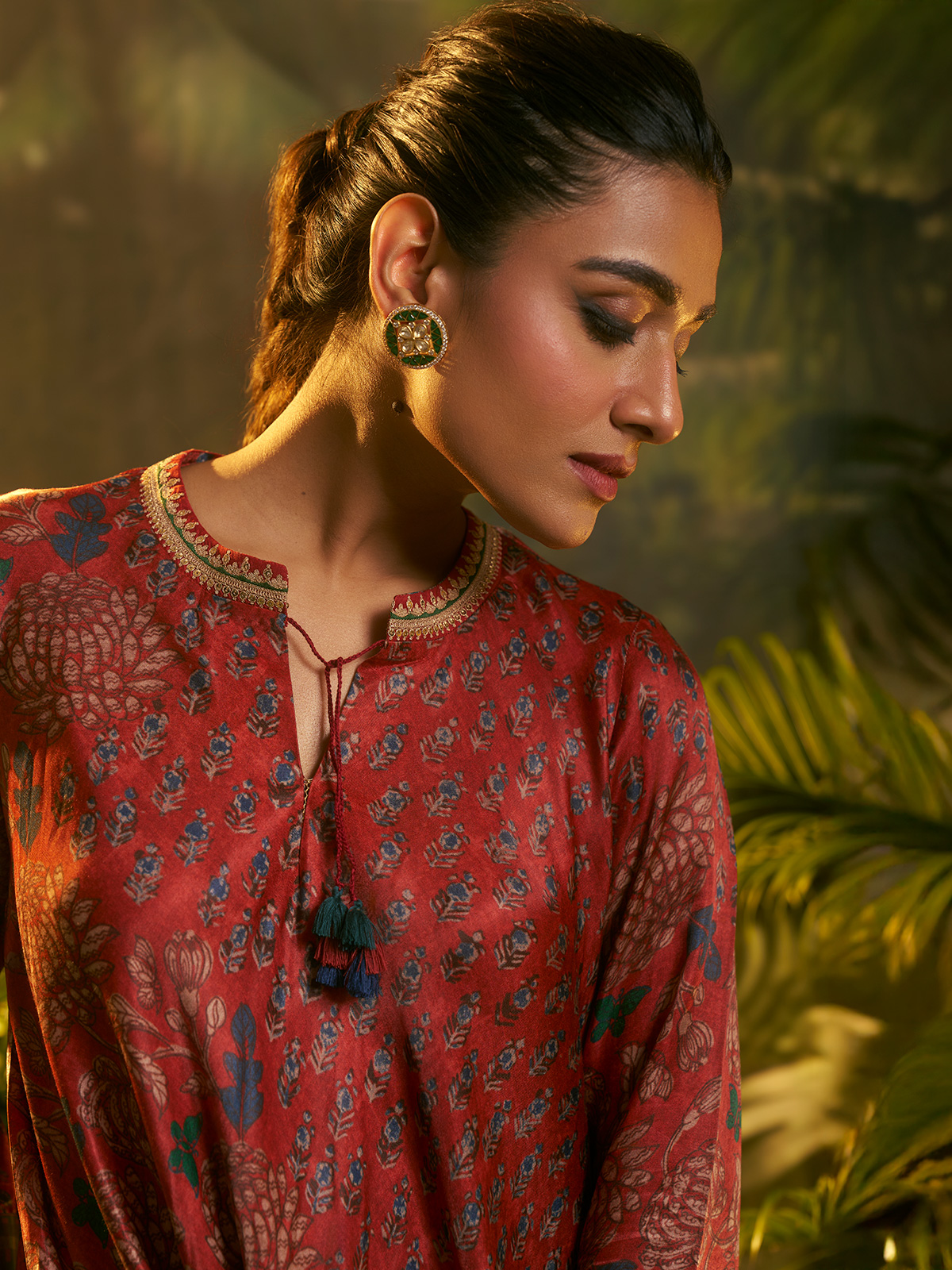 Scarlet whispers shine through this red crepe silk kurti, where resham and sequins lend a subtle gleam upon its printed canvas. A keyhole neckline and quarter sleeves complete its charm, making it a graceful pick for casual days with timeless elegance.