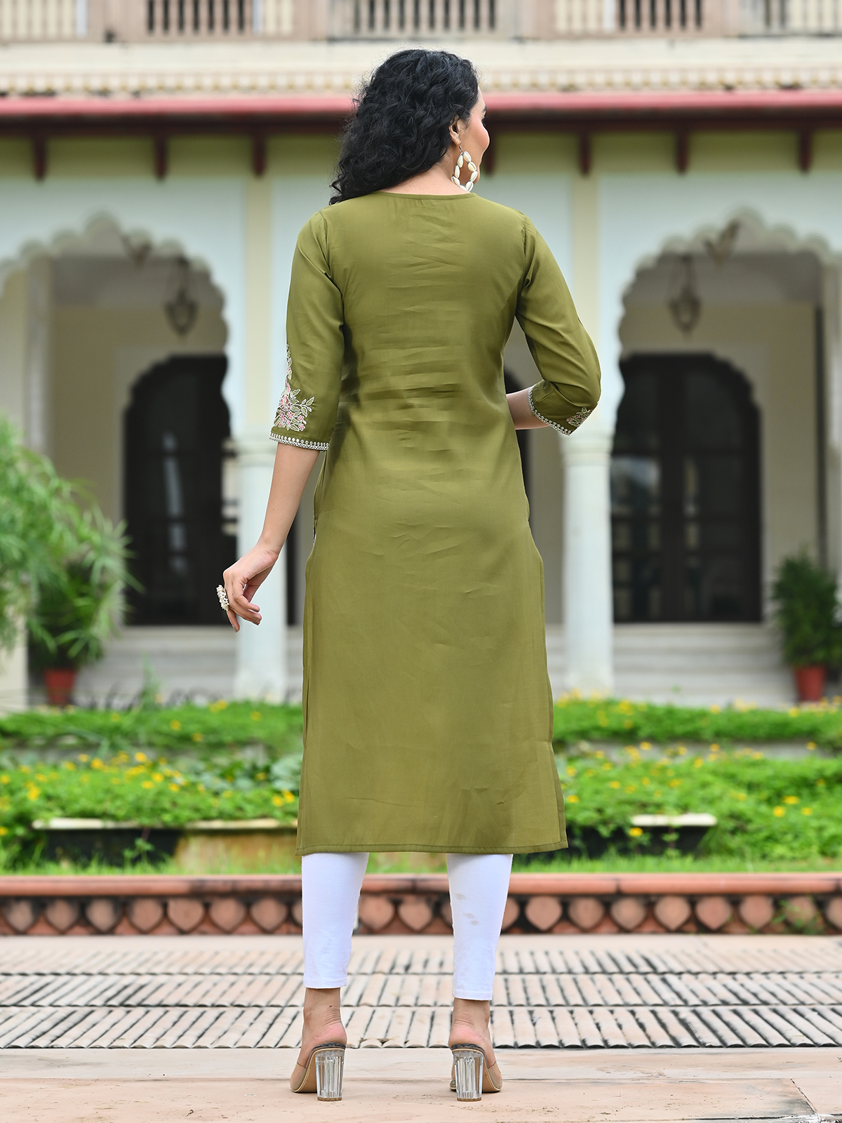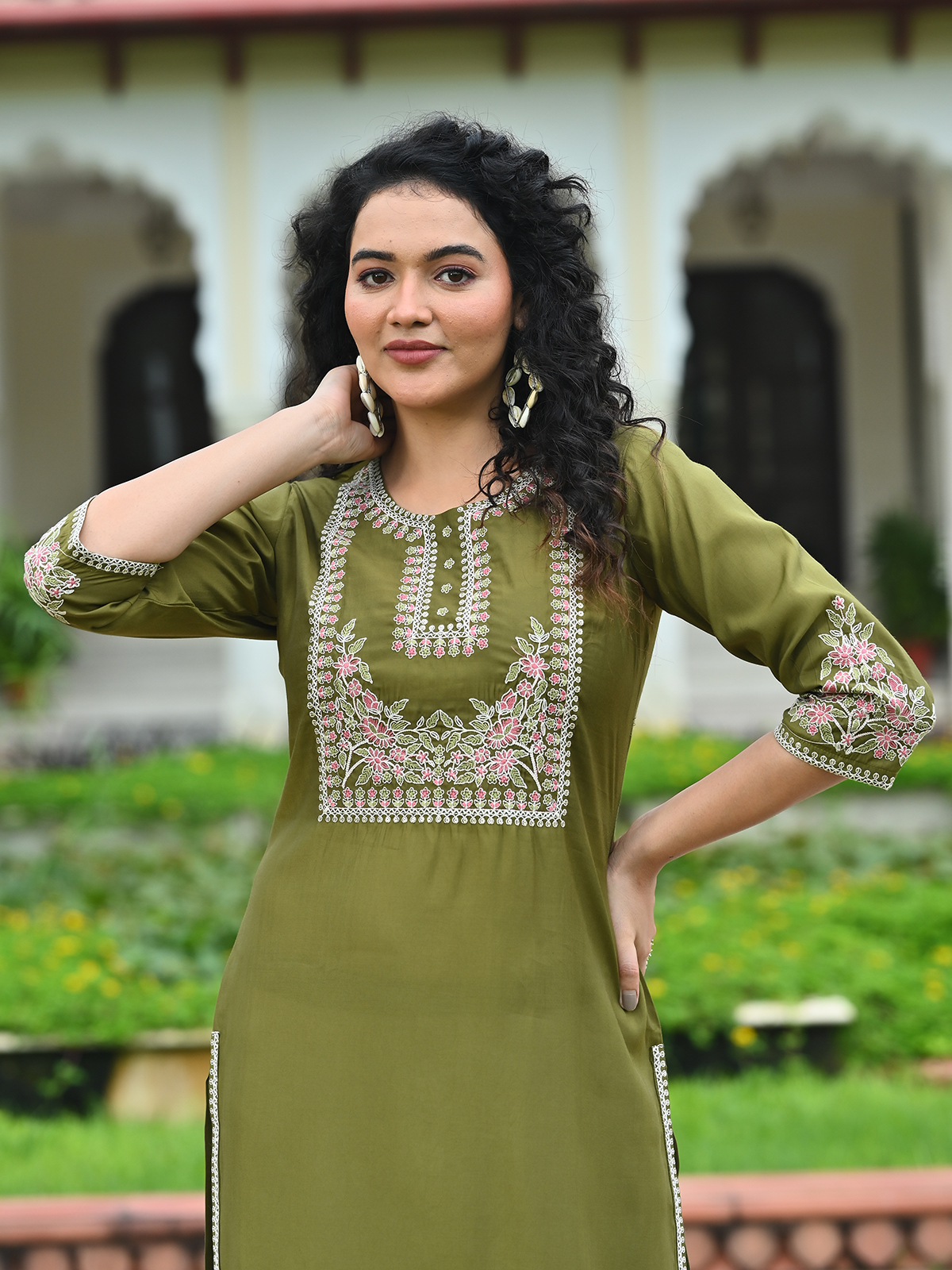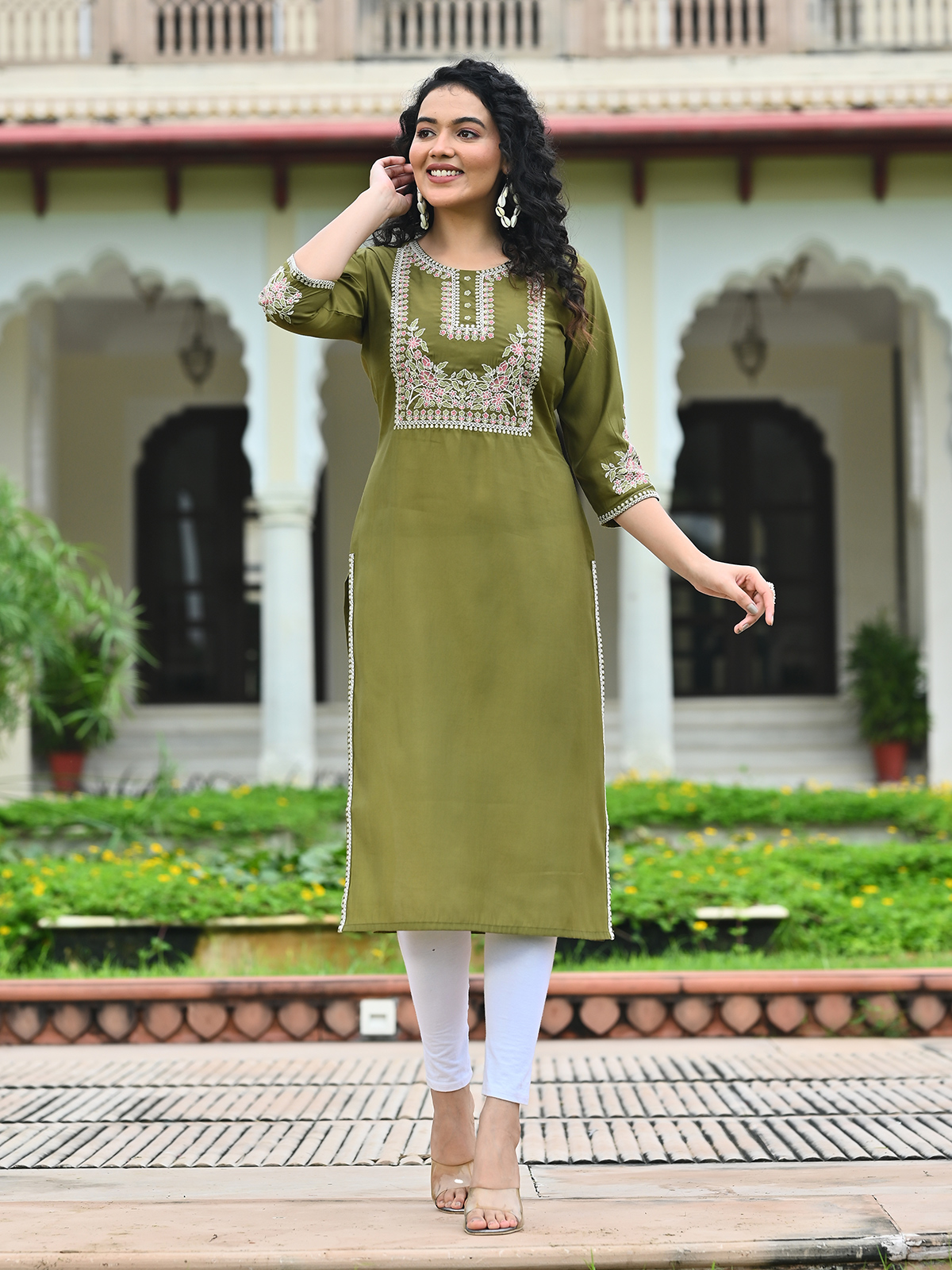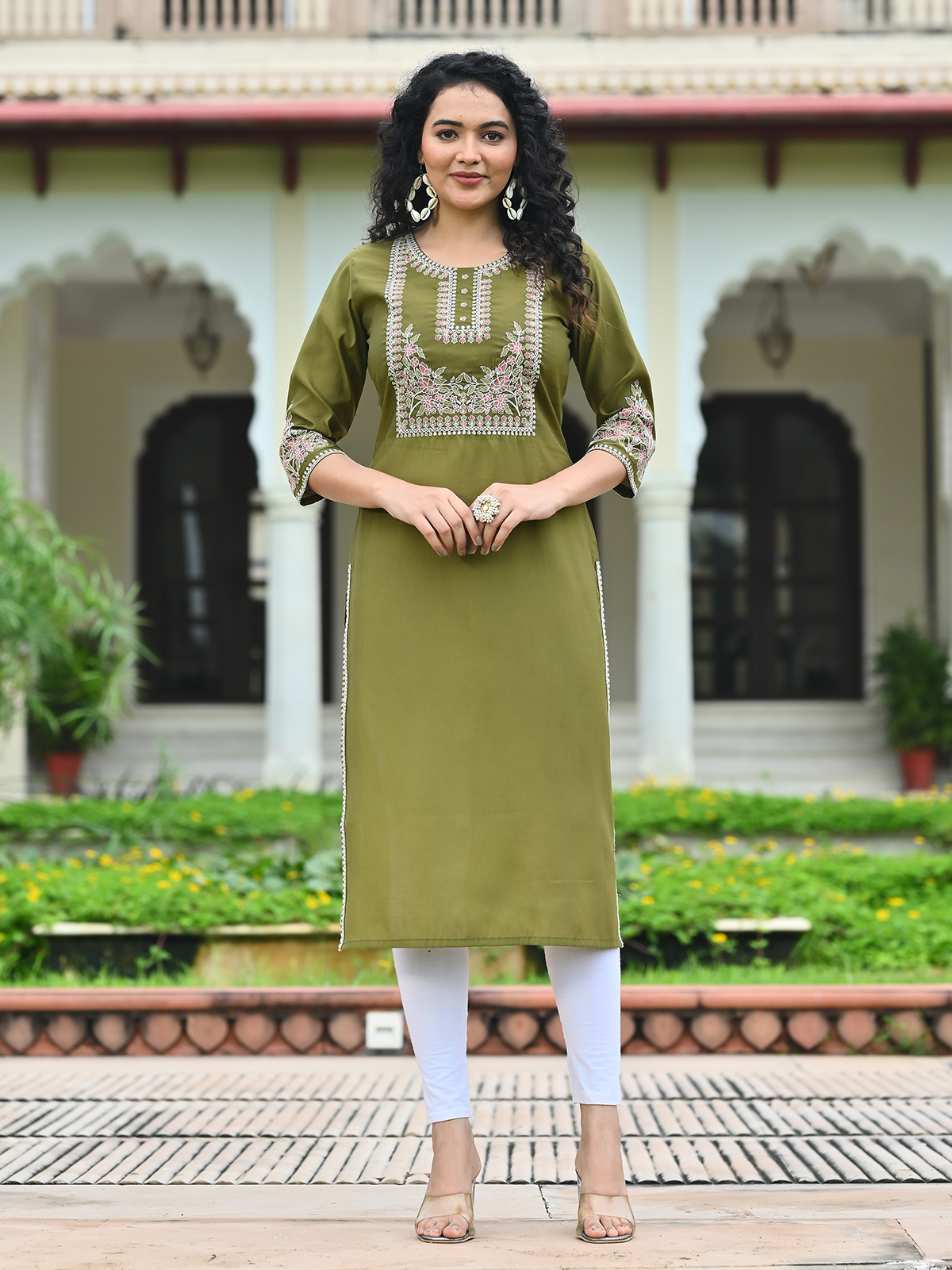 This green cotton silk kurti glows with thread, embroidery, and sequins work. Styled with a round neckline and quarter sleeves, it is a versatile casual wear option, offering timeless charm with a touch of ethnic sophistication.