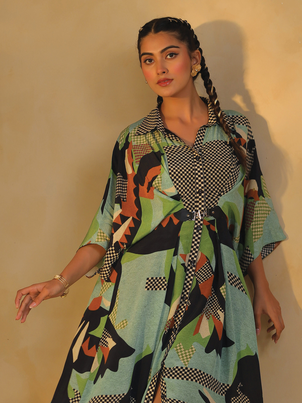 Crafted in rich green silk, this printed kurti comes with a structured collar and quarter sleeves. Simple yet polished, it carries an easy charm perfect for casual wear, while maintaining the grace needed for relaxed festive and semi-formal occasions.