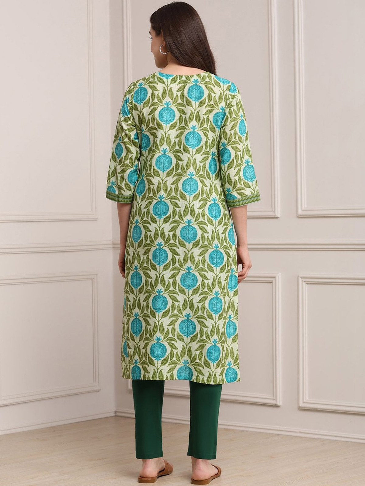 Crafted from lightweight cotton silk, this green printed straight cut kurti provides a comfortable and stylish casual look. Featuring quarter sleeves and an easy silhouette, it pairs effortlessly with pants or leggings for daily wear.