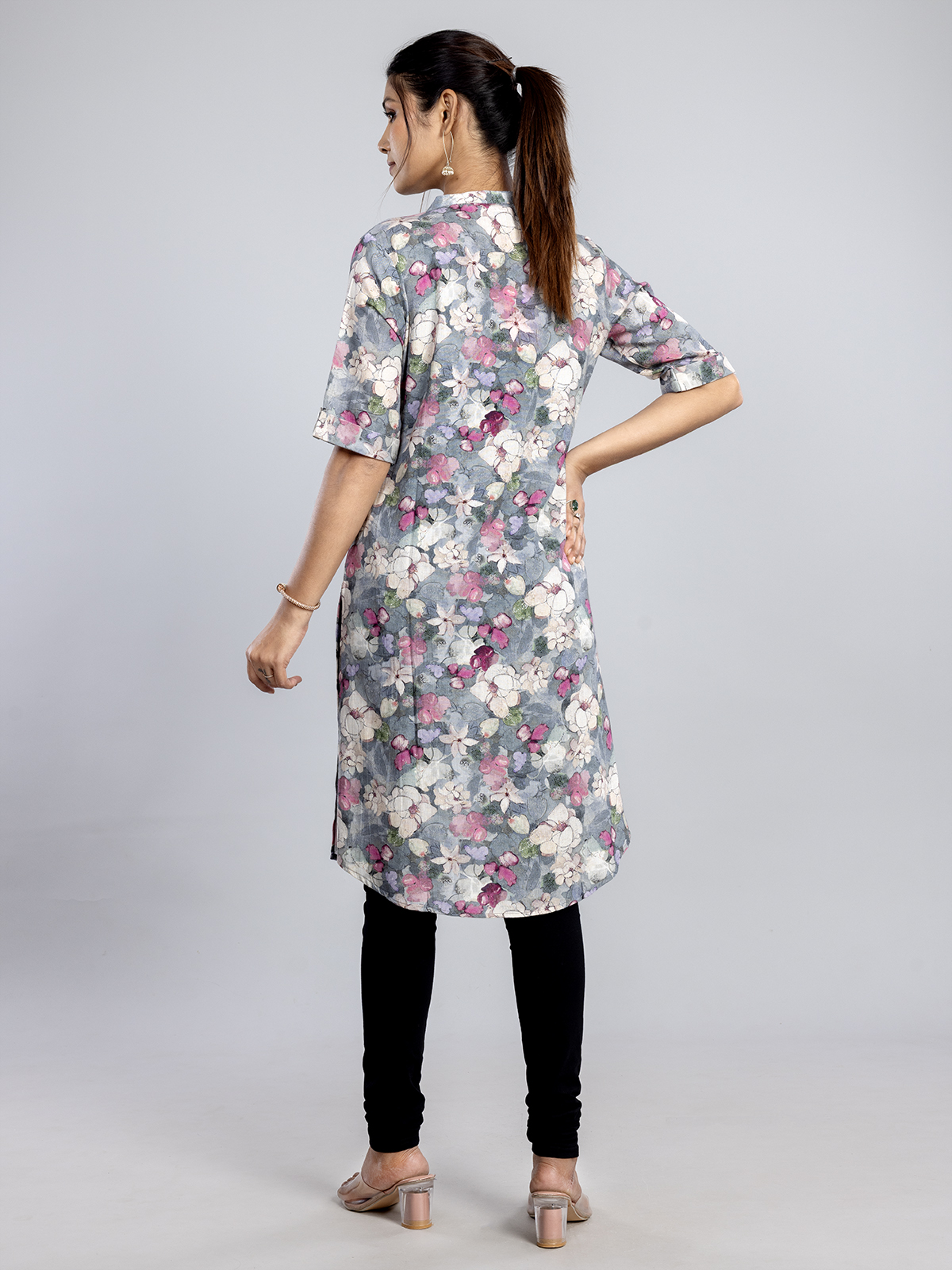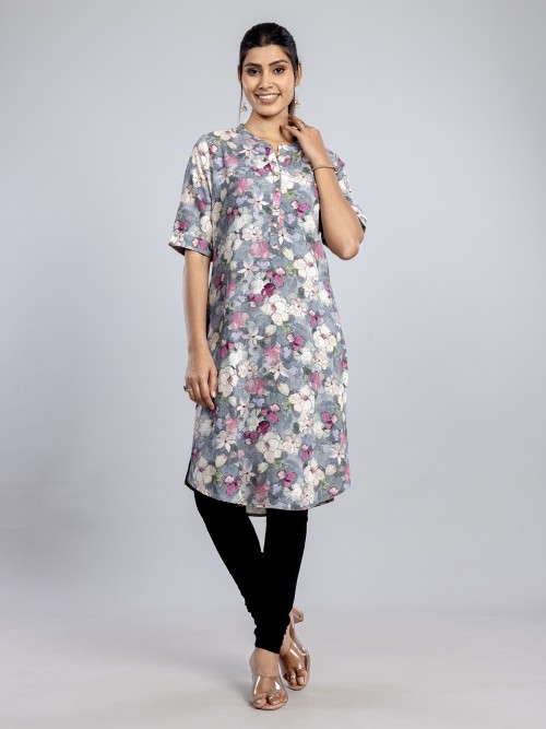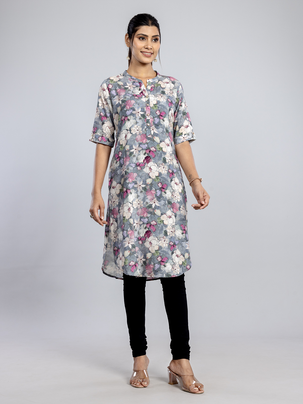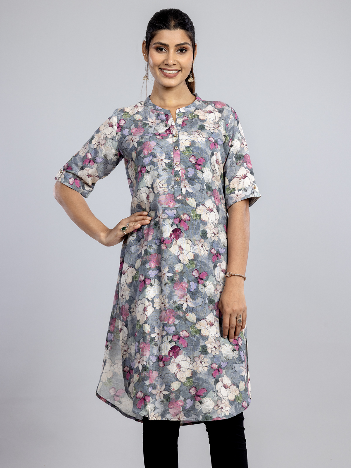 Crafted in soothing grey cotton silk, this printed kurti features a stand collar and elbow sleeves. Lightweight and elegant, it combines comfort with minimal charm, making it ideal for day-to-day wear or informal gatherings. Pair with leggings for effortless refinement.