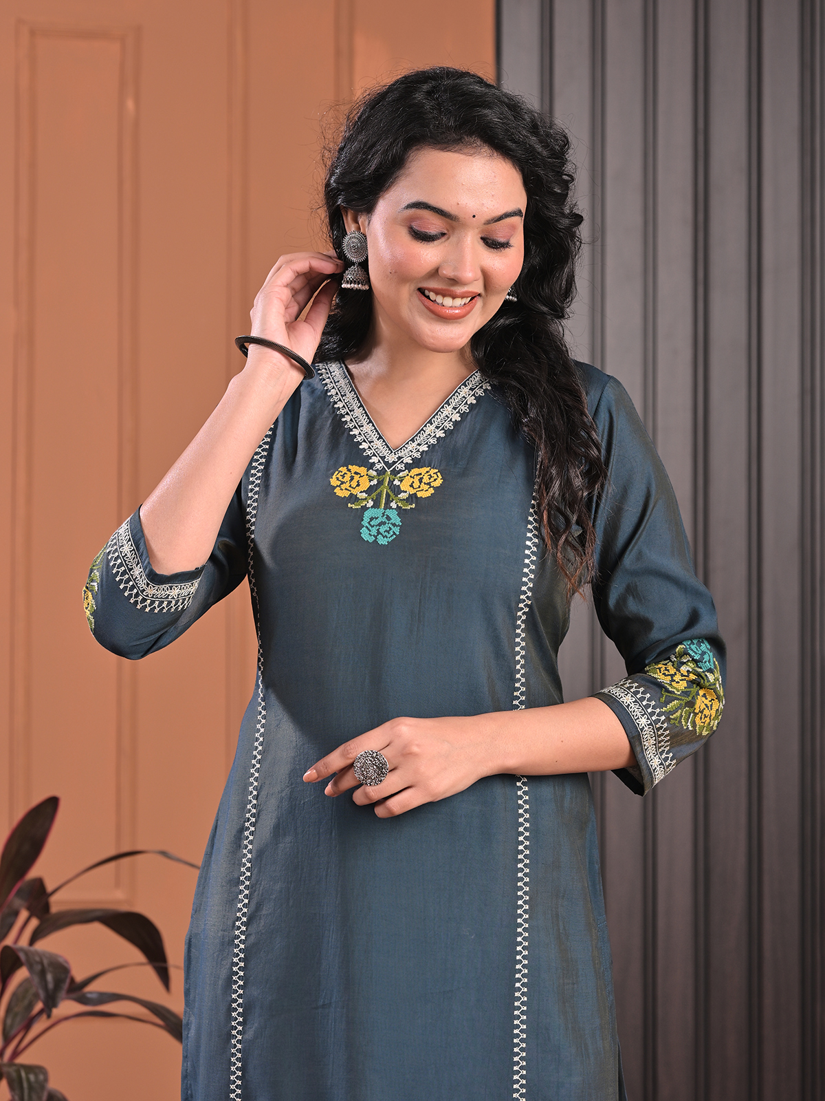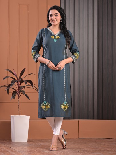 Subtle grey tones highlight the understated beauty of this silk kurti designed for casual wear. Enhanced with delicate embroidery. It reflects refined simplicity. The V neckline and quarter sleeves create a flattering silhouette. Styled in a straight cut. This kurti offers a perfect blend of comfort and modern elegance.