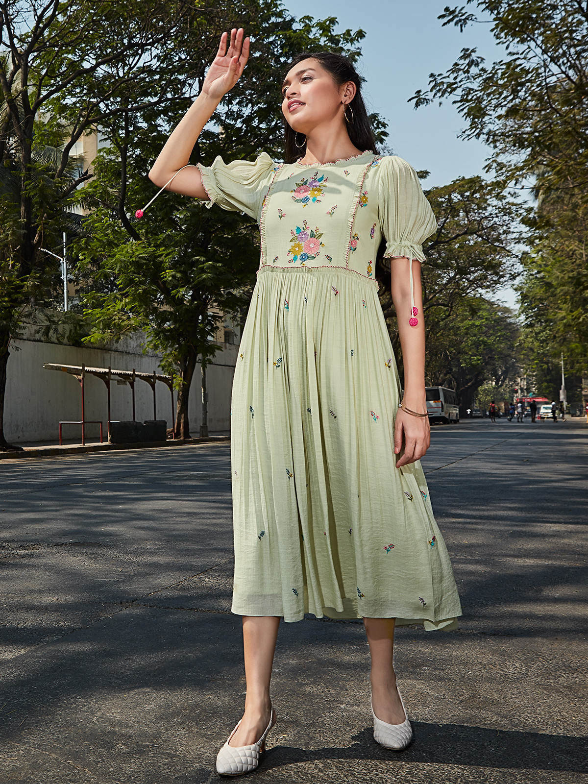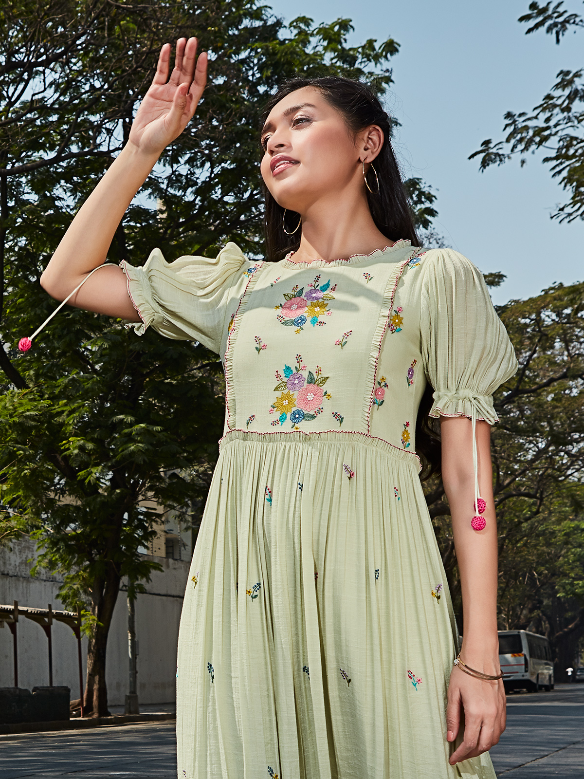 This pista green cotton kurti complemented by the elegant embroidery work, makes it versatile for casual outings or family gatherings. It has a round neck and half sleeves to complete a look that is as elegant as it is comfortable for you.