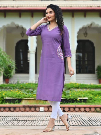Graceful lavender purple tones define this silk kurti designed for everyday elegance. Enhanced with subtle embroidery work. It reflects soft feminine charm. The V neckline and quarter sleeves create a flattering silhouette. Styled in a straight cut. This kurti is perfect for casual outings with a refined touch.