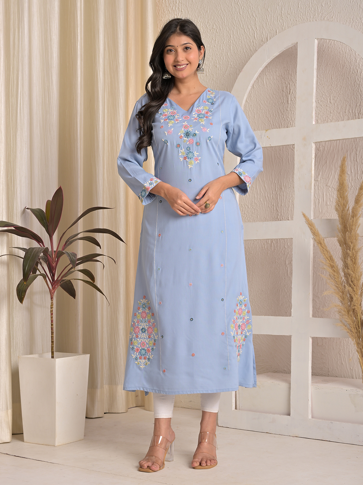 Light Blue Embroidered Sequins Silk Casual Kurti