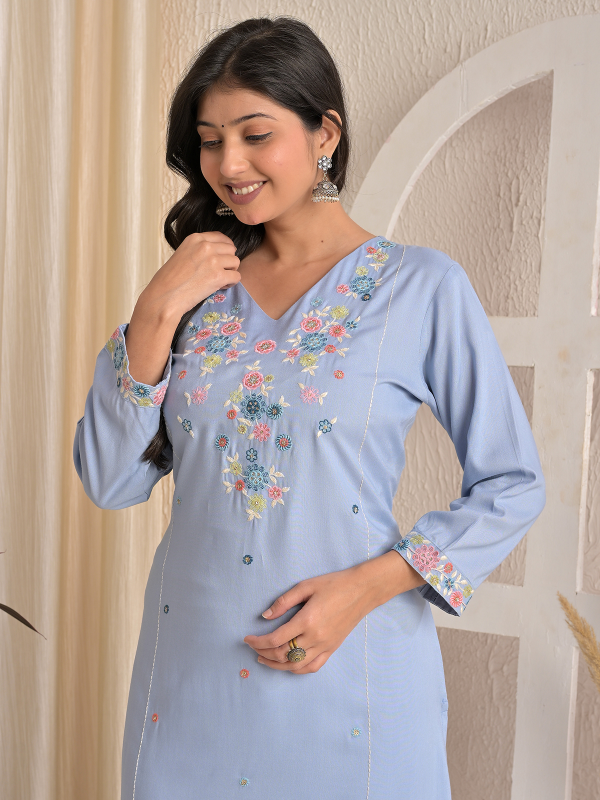 Soft and soothing light blue silk kurti. Showcases refined embroidery with gentle sequin detailing. Featuring a V neckline and quarter sleeves, it delivers effortless comfort and a serene aesthetic, making it ideal for everyday casual elegance.