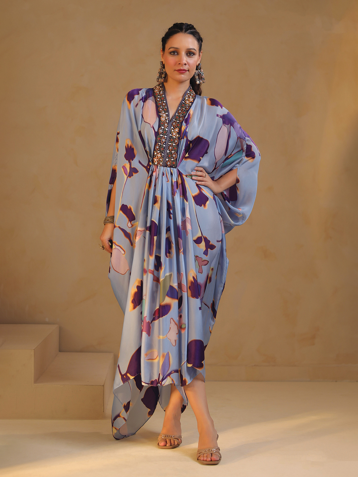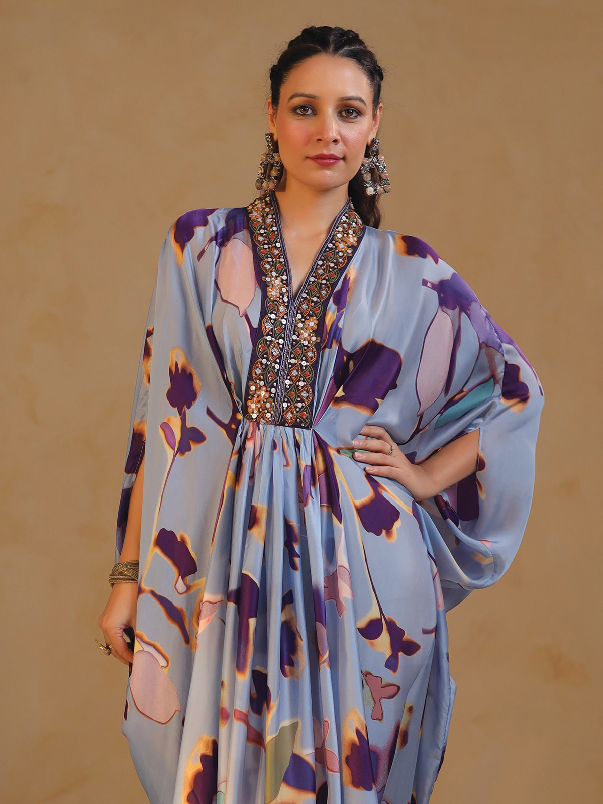 Designed in soothing light blue silk, this printed kurti glimmers with sequins, beads, and cutdana embellishments. A graceful V neckline adds finesse, making it an exquisite choice for festivals, family occasions, and traditional gatherings filled with elegance and joy.