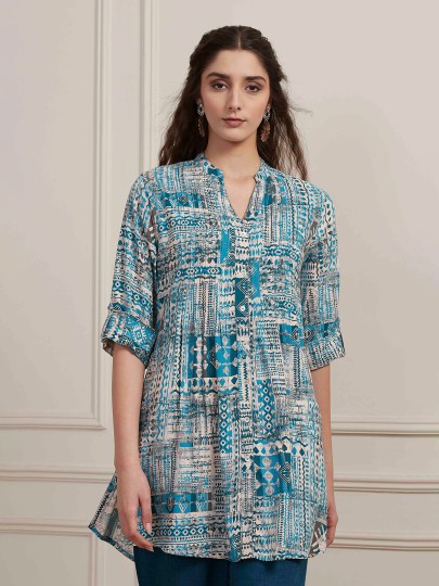 This light blue printed short kurti is crafted from breathable cotton silk for all-day comfort. Featuring quarter sleeves and a modern silhouette, it is perfect for casual wear, daily errands, and pairing with jeans or trousers.