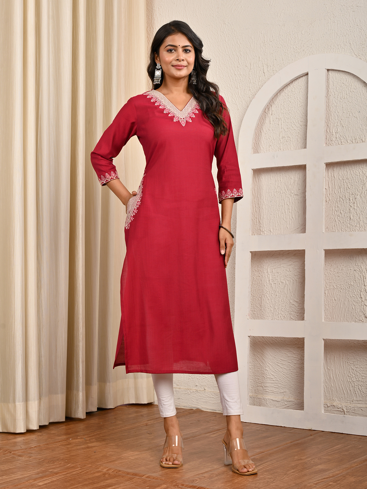 Drape yourself in elegance with this maroon cotton silk kurti, highlighted with embroidery and sequins. Featuring a stylish V-neck and quarter sleeves, it offers comfort with tradition. A graceful addition, perfect for casual gatherings and day-to-day ethnic wear.