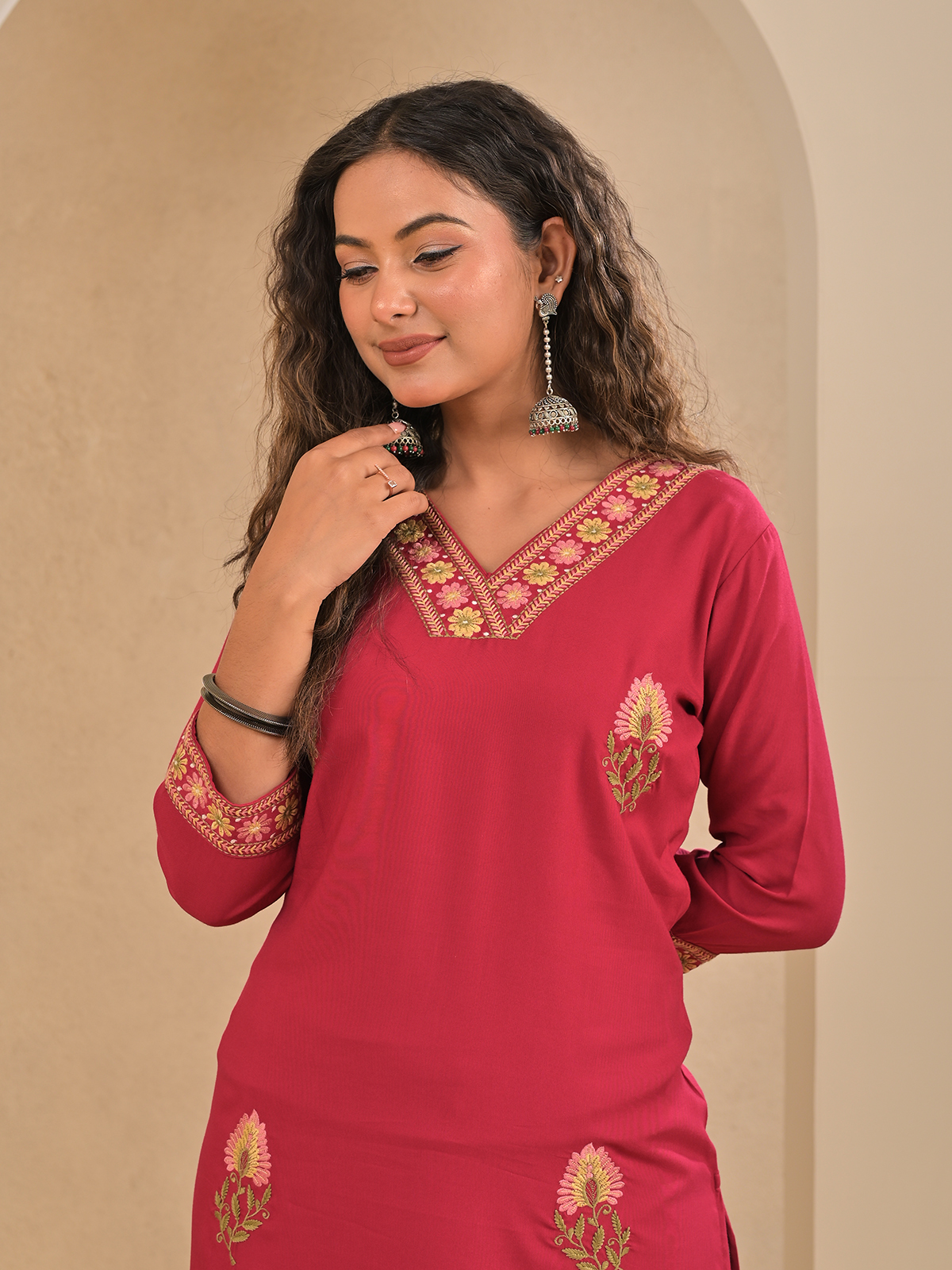 Deep maroon tones enhance the charm of this silk kurti designed for everyday elegance. Detailed with fine embroidery, it offers subtle sophistication. The V neckline and quarter sleeves create a flattering silhouette. Styled in a straight cut. This kurti is perfect for casual outings and relaxed ethnic wear.