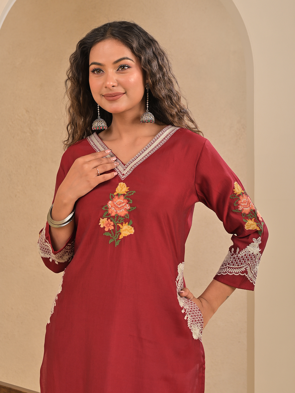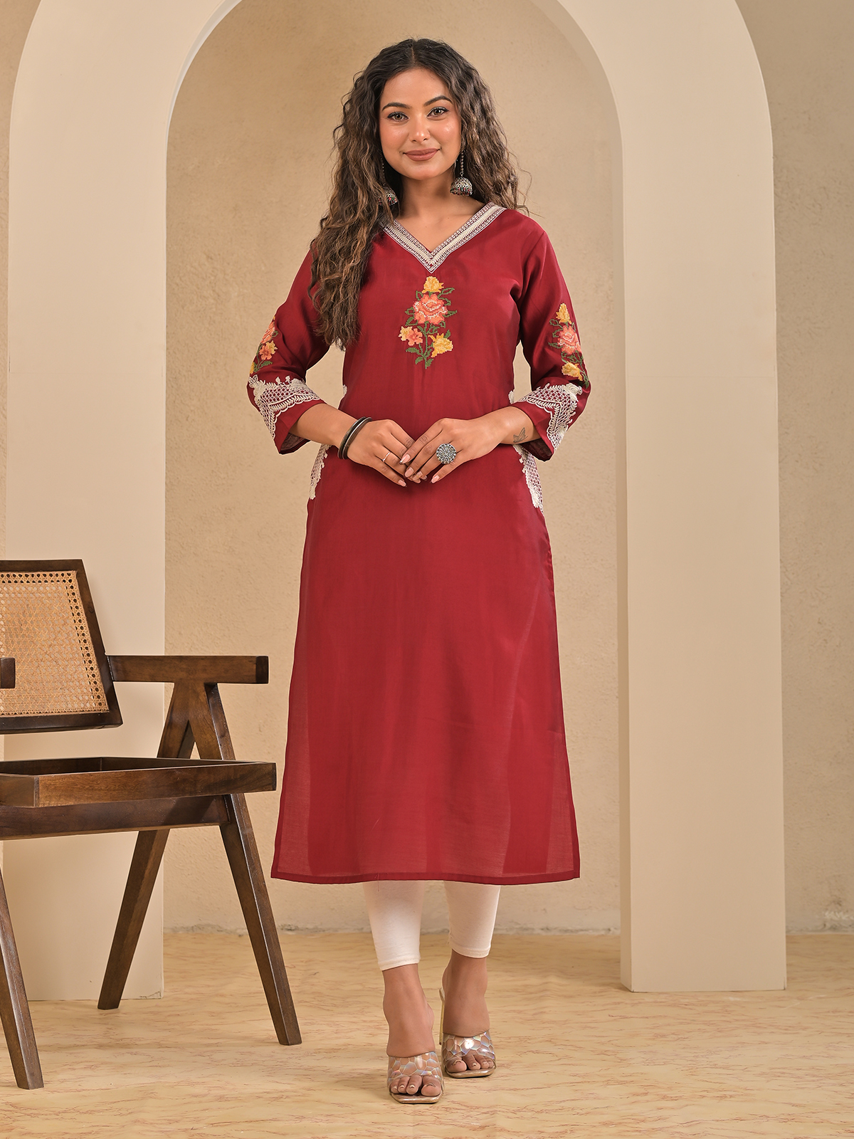 Maroon Silk Embroidered V Neck Casual Kurti For Women