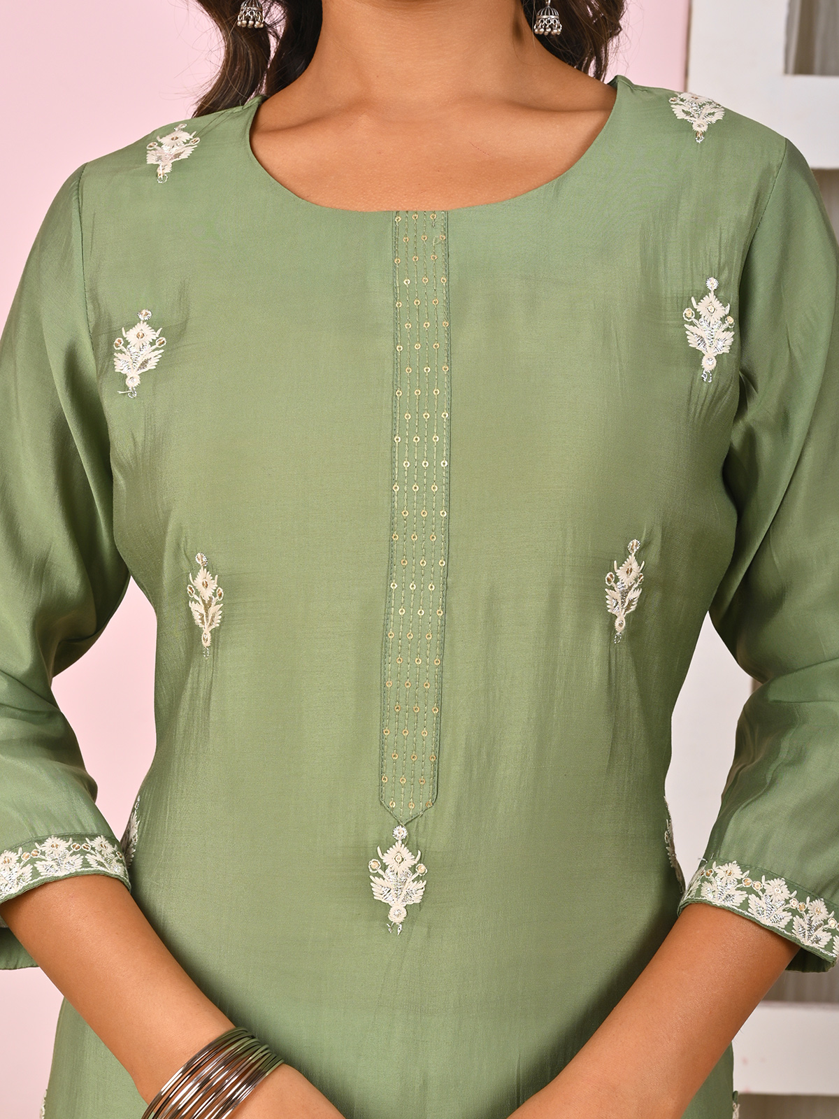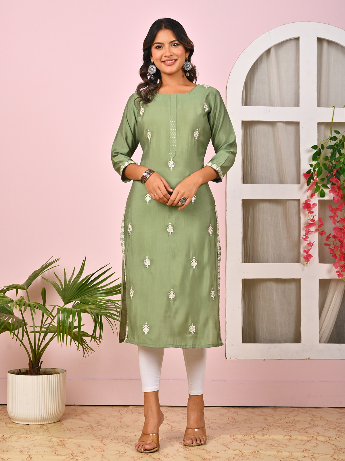 In soothing mehendi green cotton silk, this kurti is adorned with sequins and embroidery work. Designed with a round neckline and quarter sleeves, it is ideal for casual outings, bringing a refreshing ethnic charm with understated elegance.