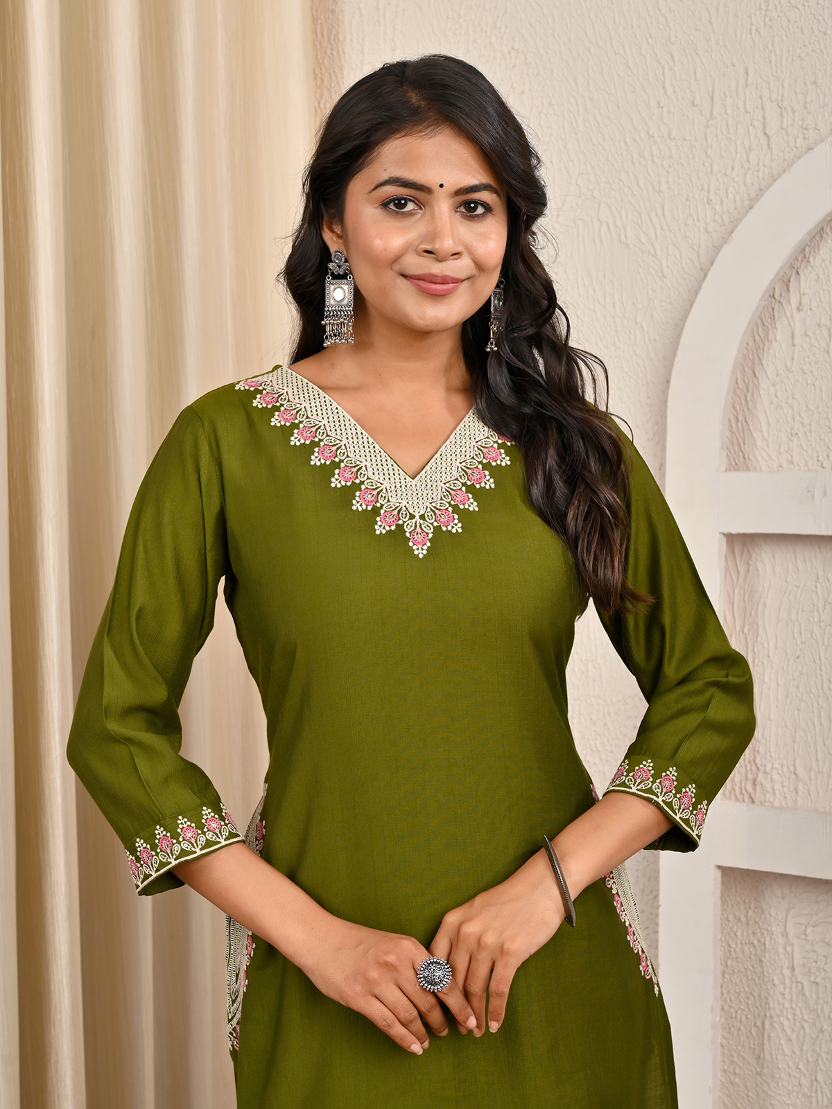 Bring natural beauty into your look with this mehendi green cotton silk kurti, detailed with embroidery and sequins. Its V-neckline and quarter sleeves balance ease with style. A versatile piece, perfect for casual wear that reflects ethnic charm with a subtle festive vibe.