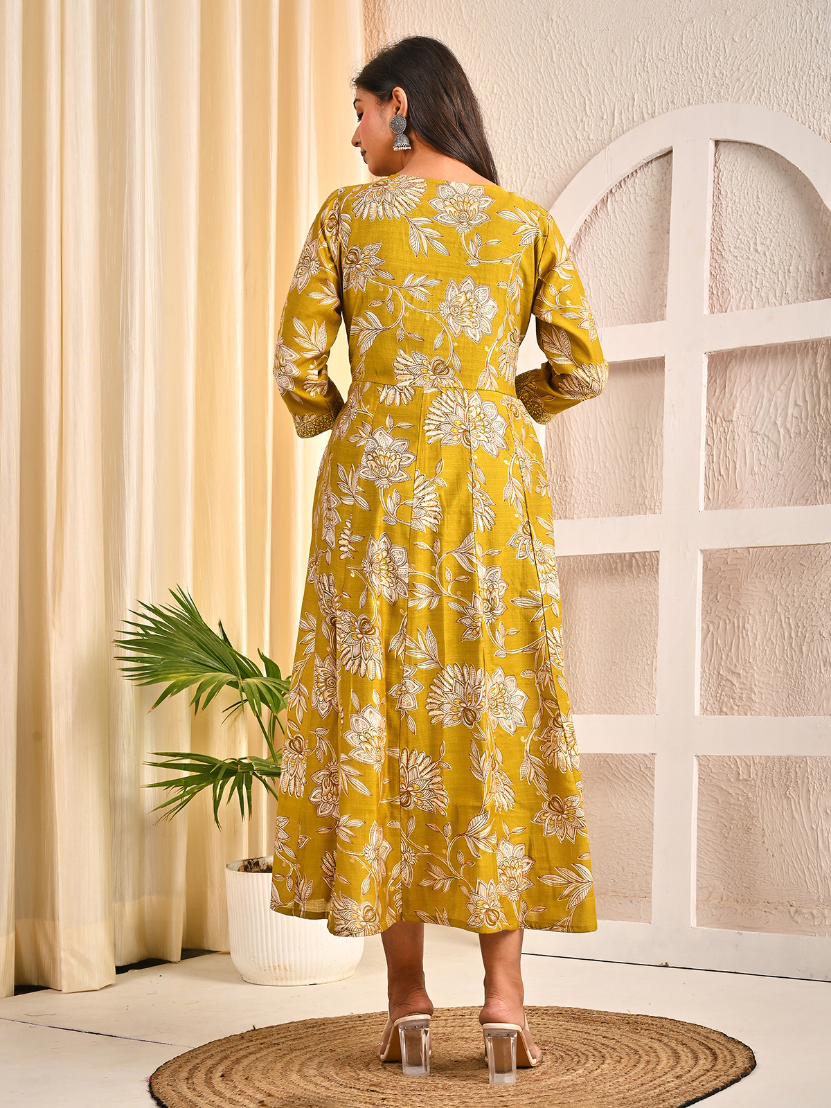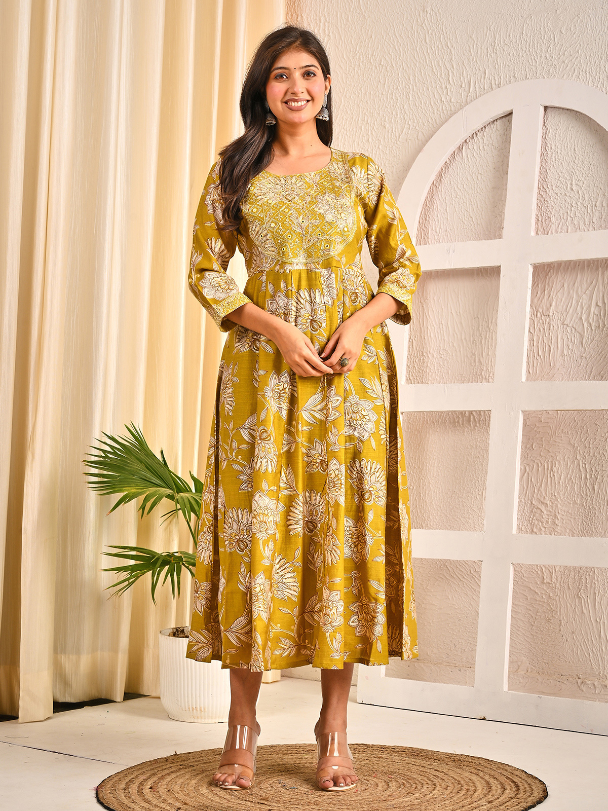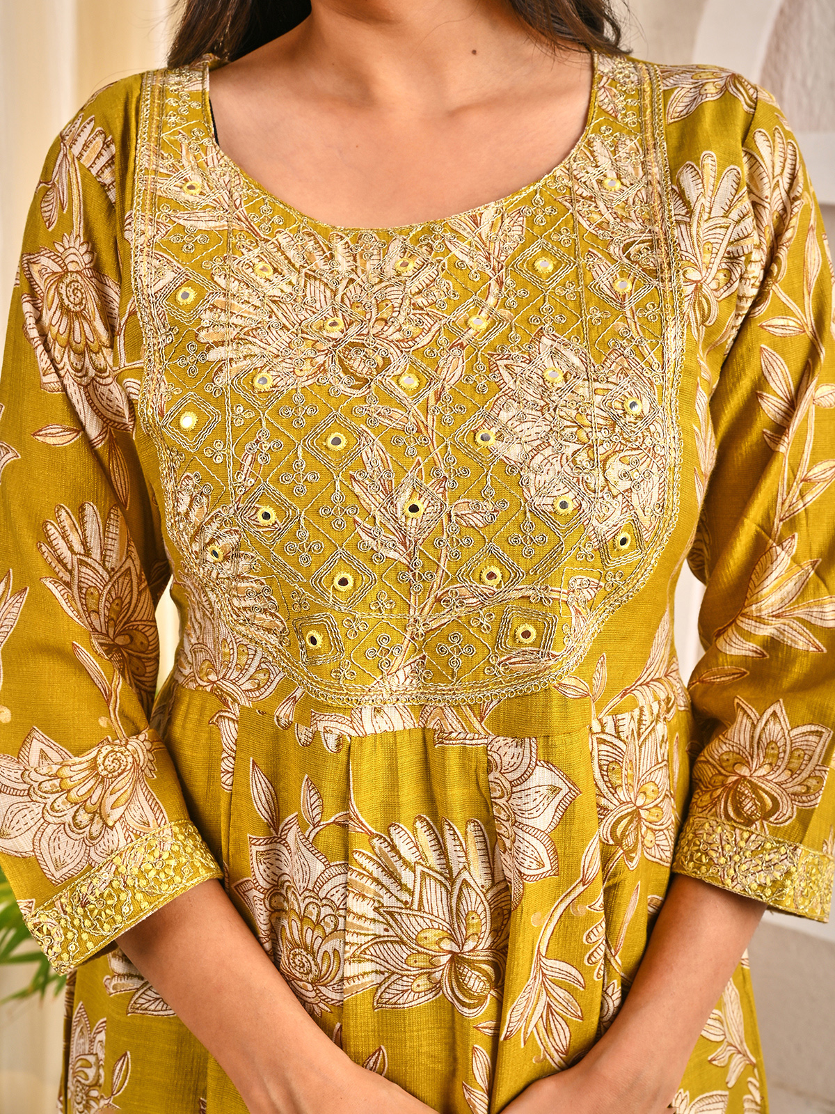 Exquisite in mehendi olive, this cotton silk kurti is decorated with floral prints and a yoke embellished with embroidery, sequins, resham, and aabla. With a round neckline and quarter sleeves, it perfectly merges traditional artistry with everyday elegance.
