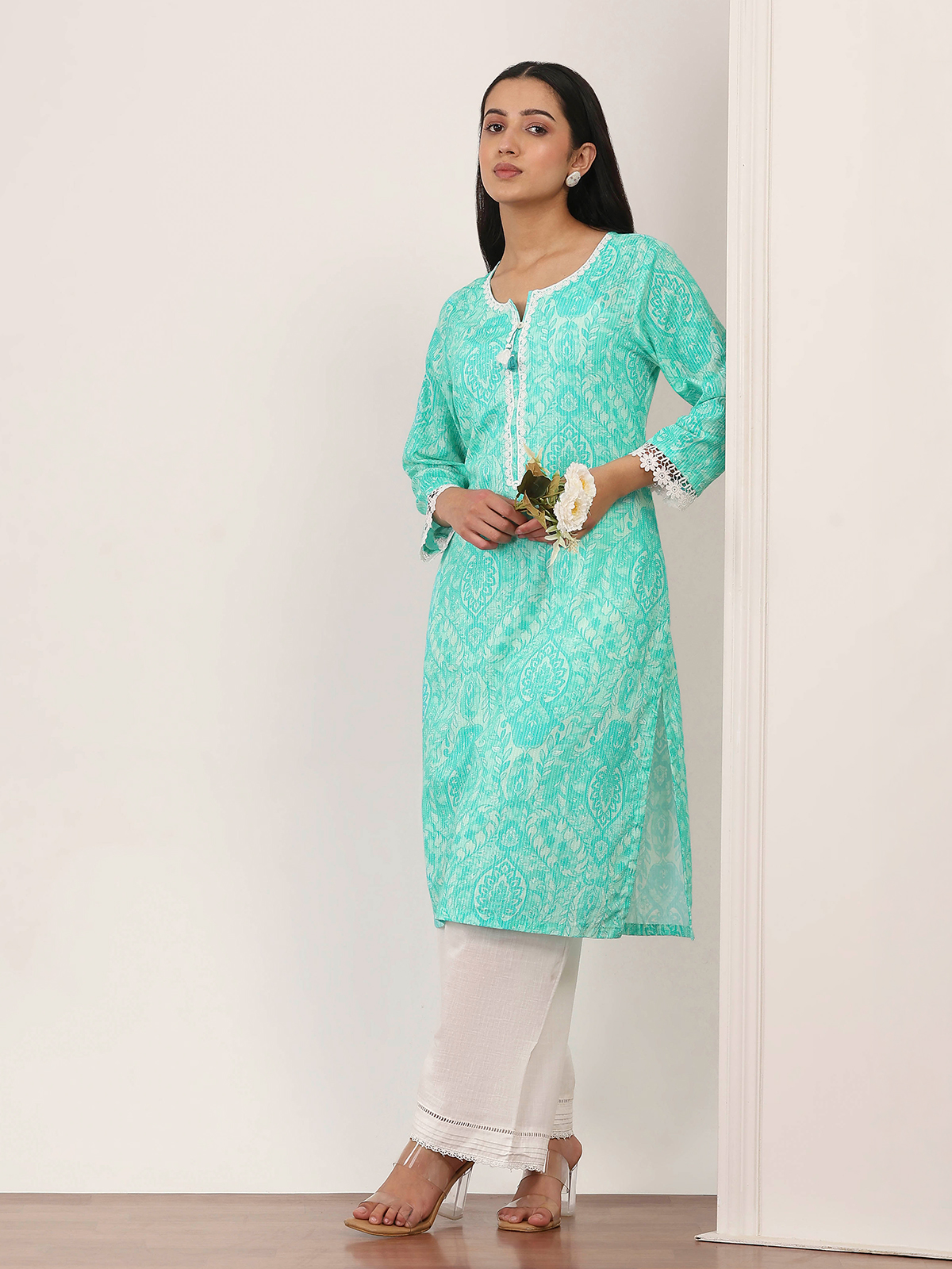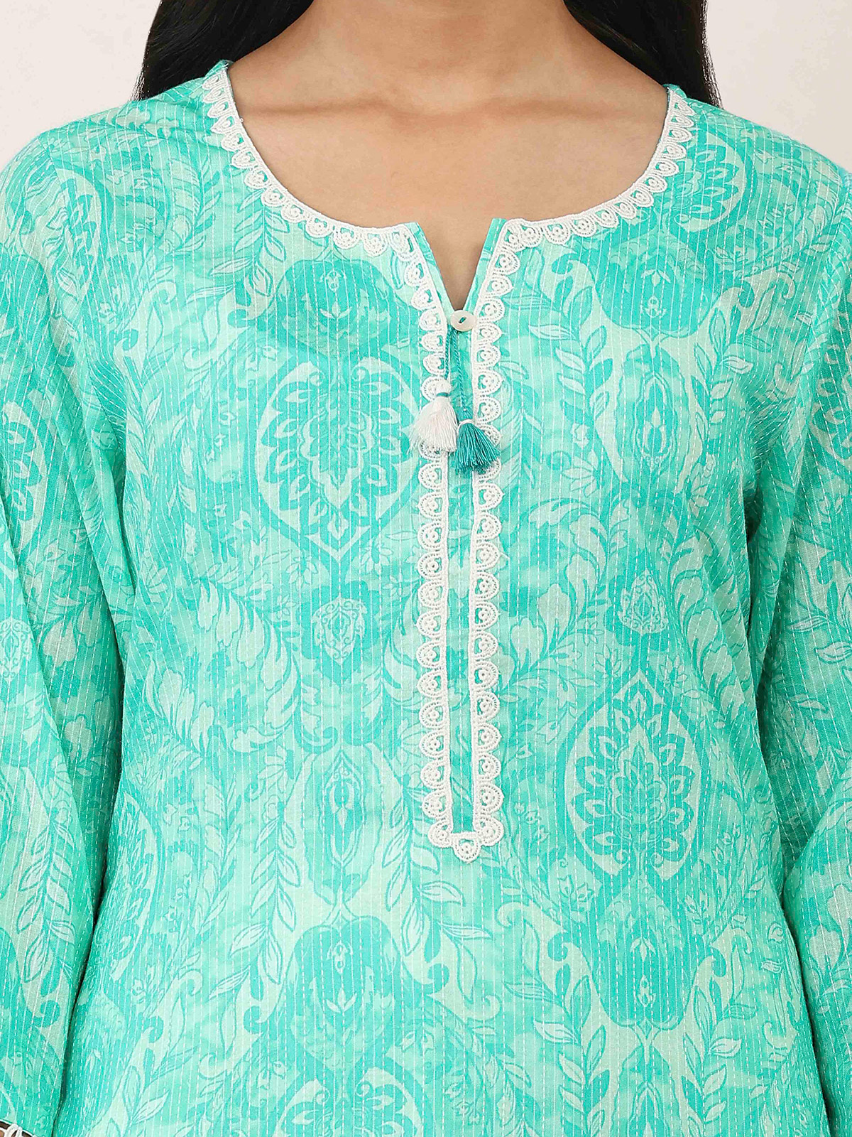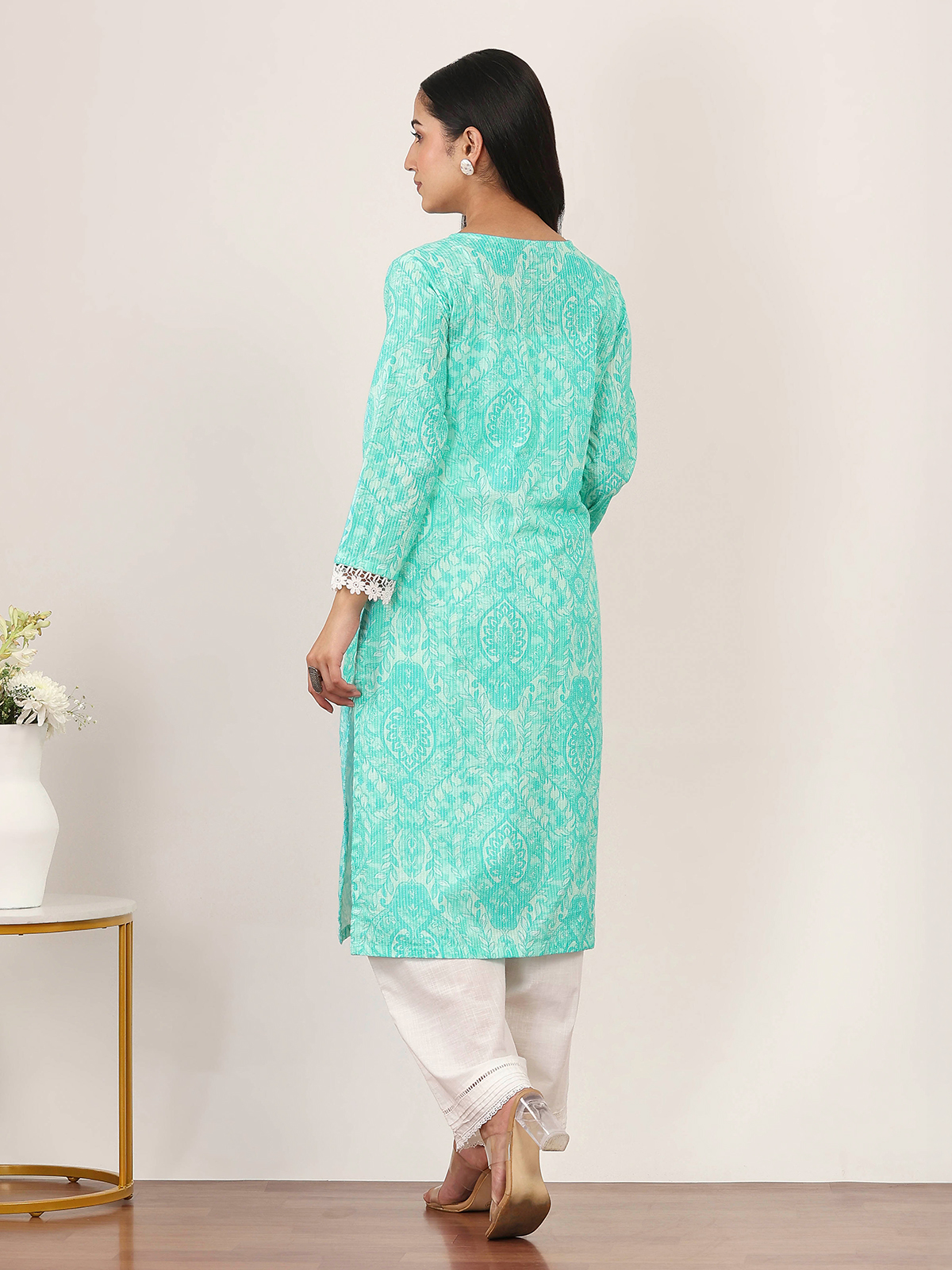 Cool mint green tones bring a refreshing feel to this cotton kurti crafted for relaxed daily wear. Highlighted with subtle printed patterns, it exudes light and breezy charm. Designed with comfortable quarter sleeves, it offers an easy silhouette. Perfect for casual occasions, this kurti blends simplicity with fresh elegance for everyday styling.