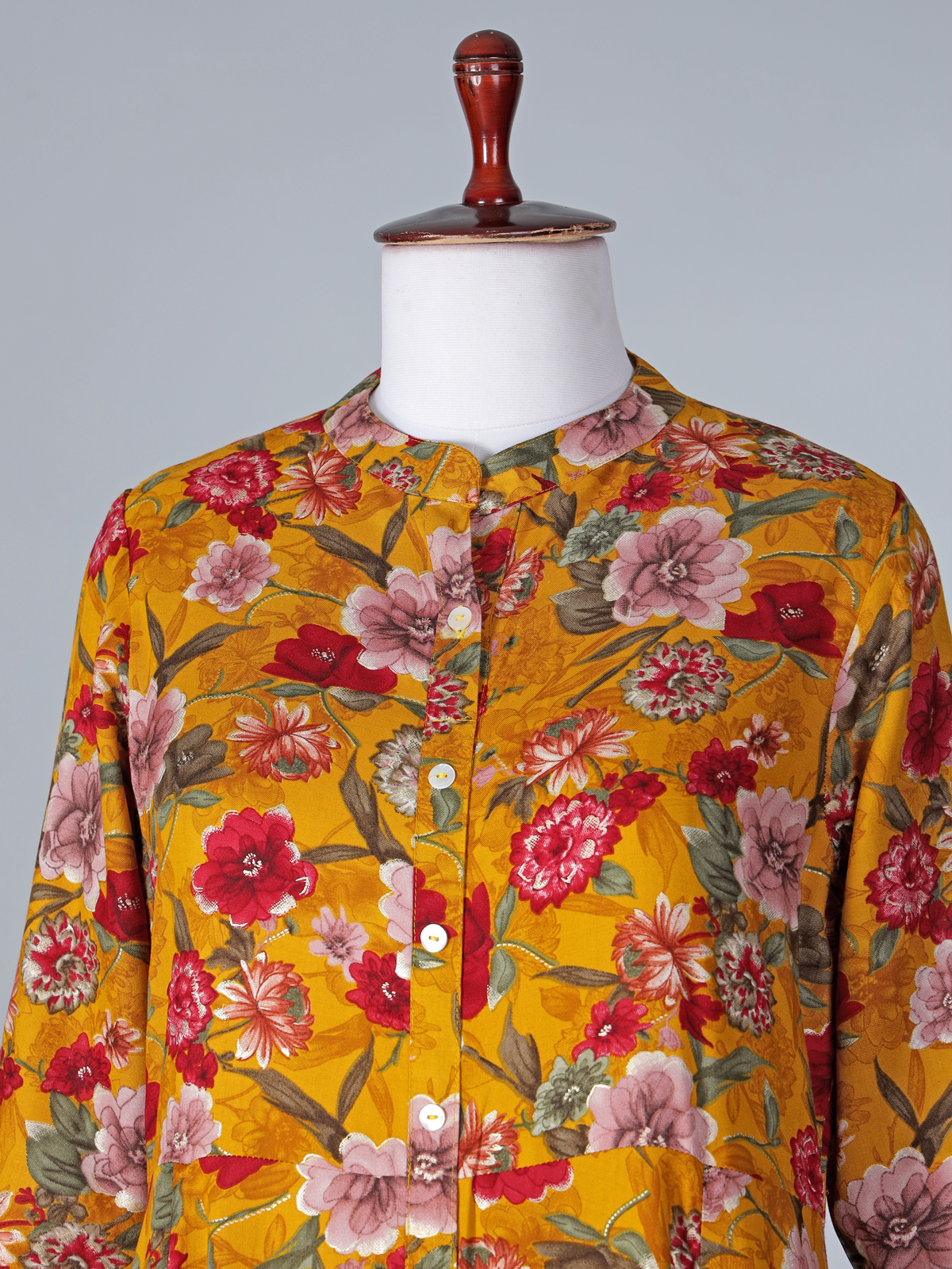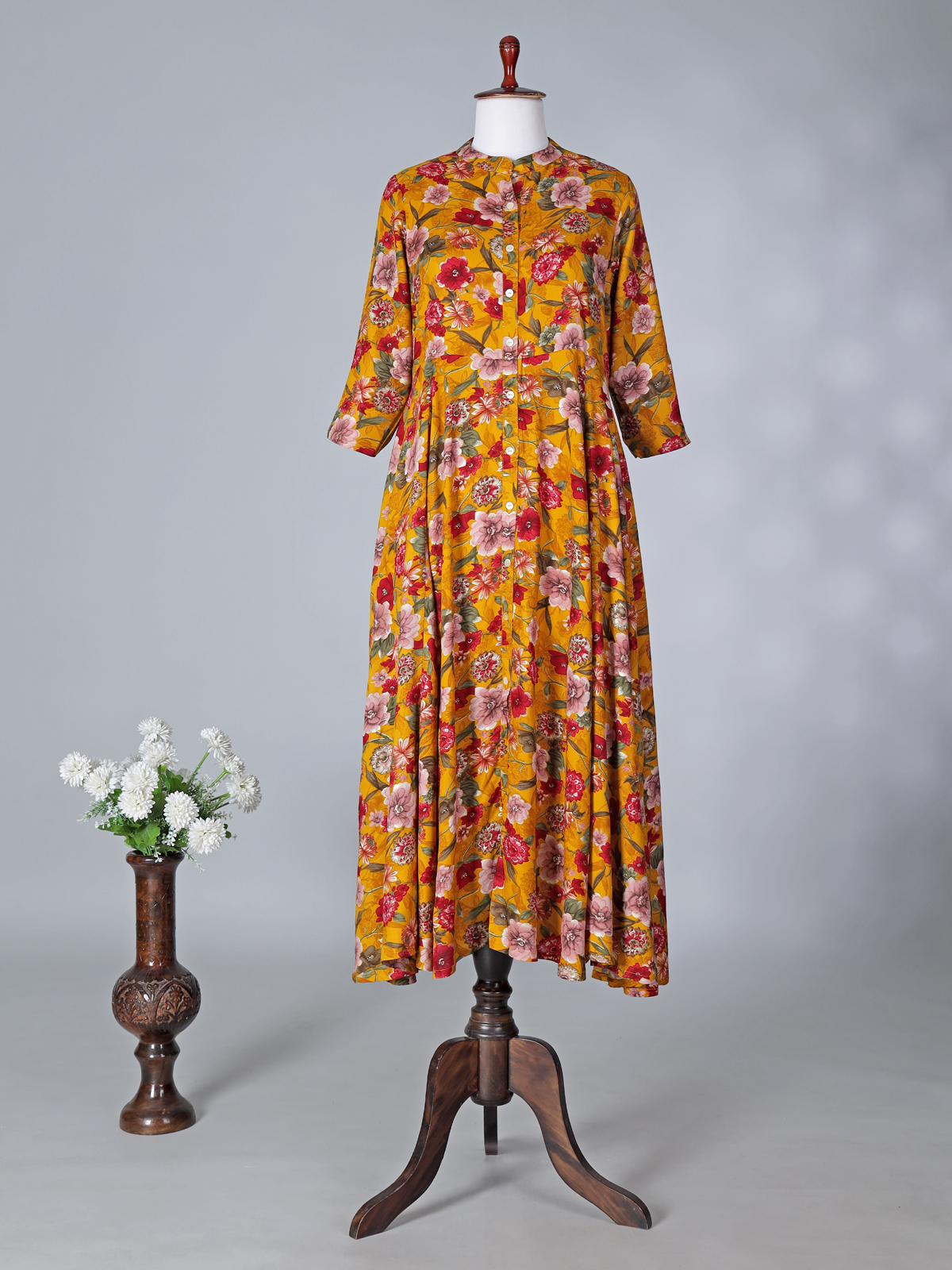 Effortlessly graceful and refreshingly stylish, this mustard yellow cotton silk kurti enhances a woman’s everyday charm with its soft sheen and breathable comfort. Designed with a smart stand collar and quarter sleeves, it features delicate floral prints that add subtle elegance. Perfect for casual outings, office wear, and relaxed daytime gatherings.