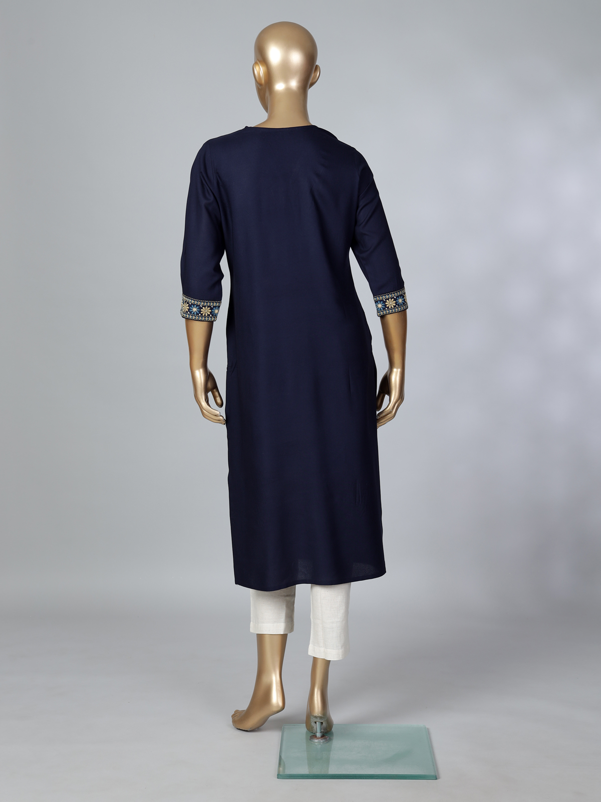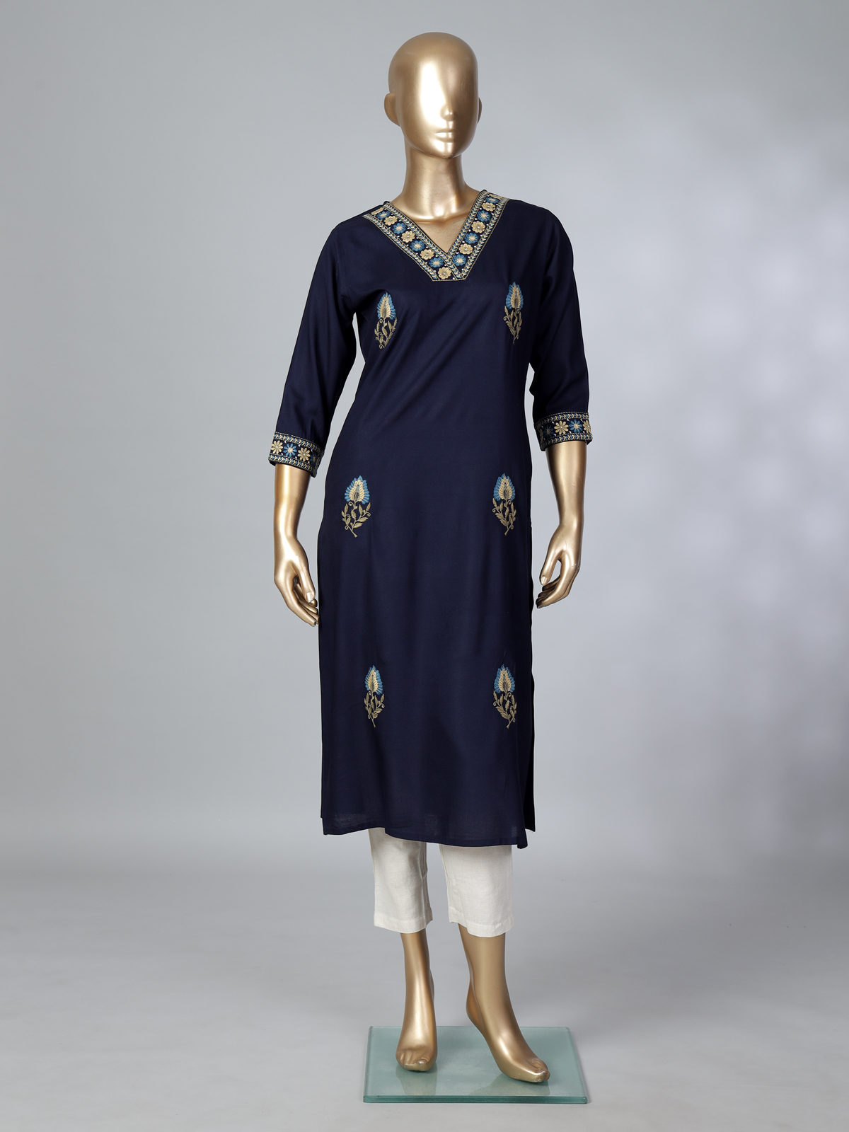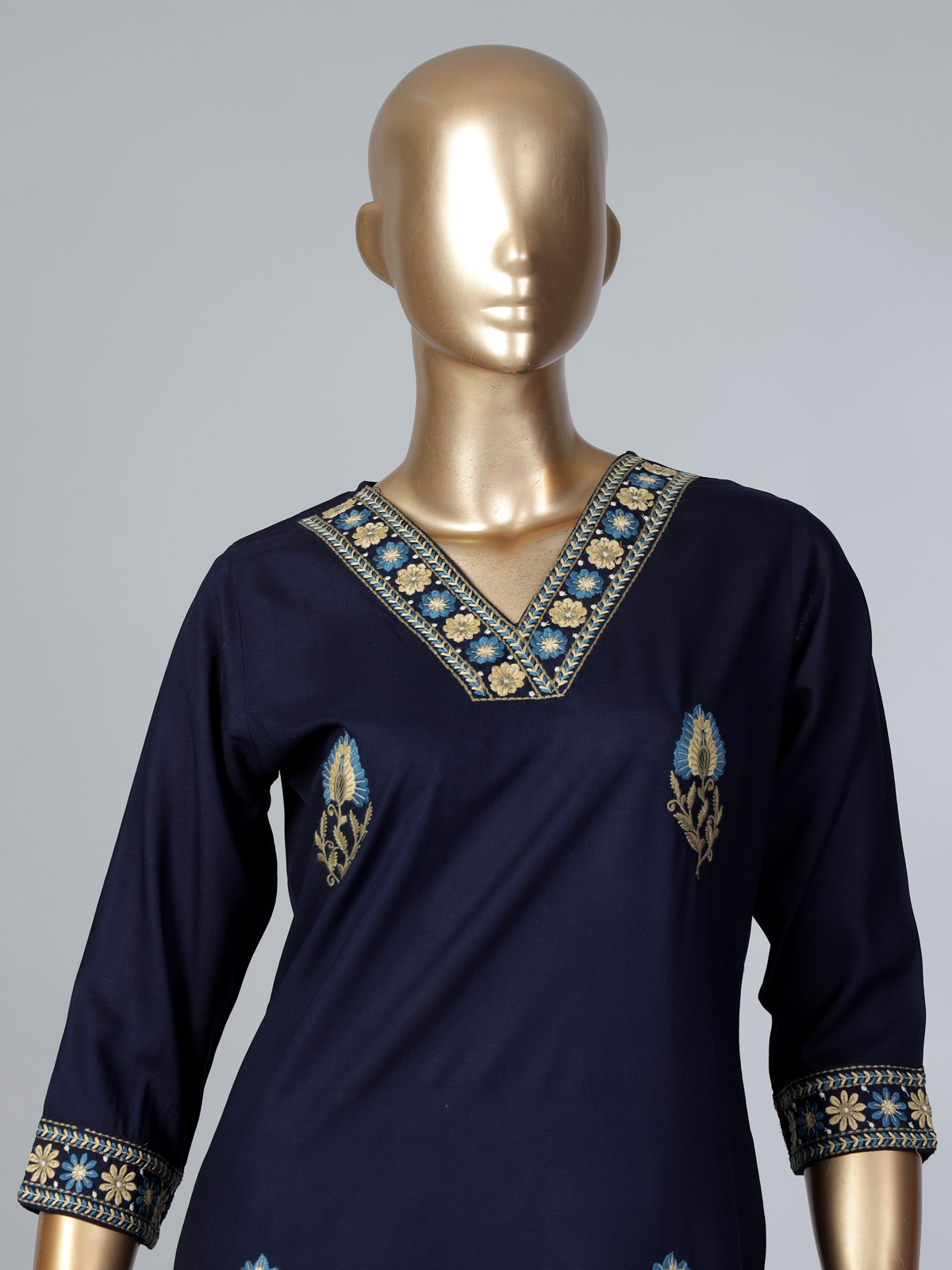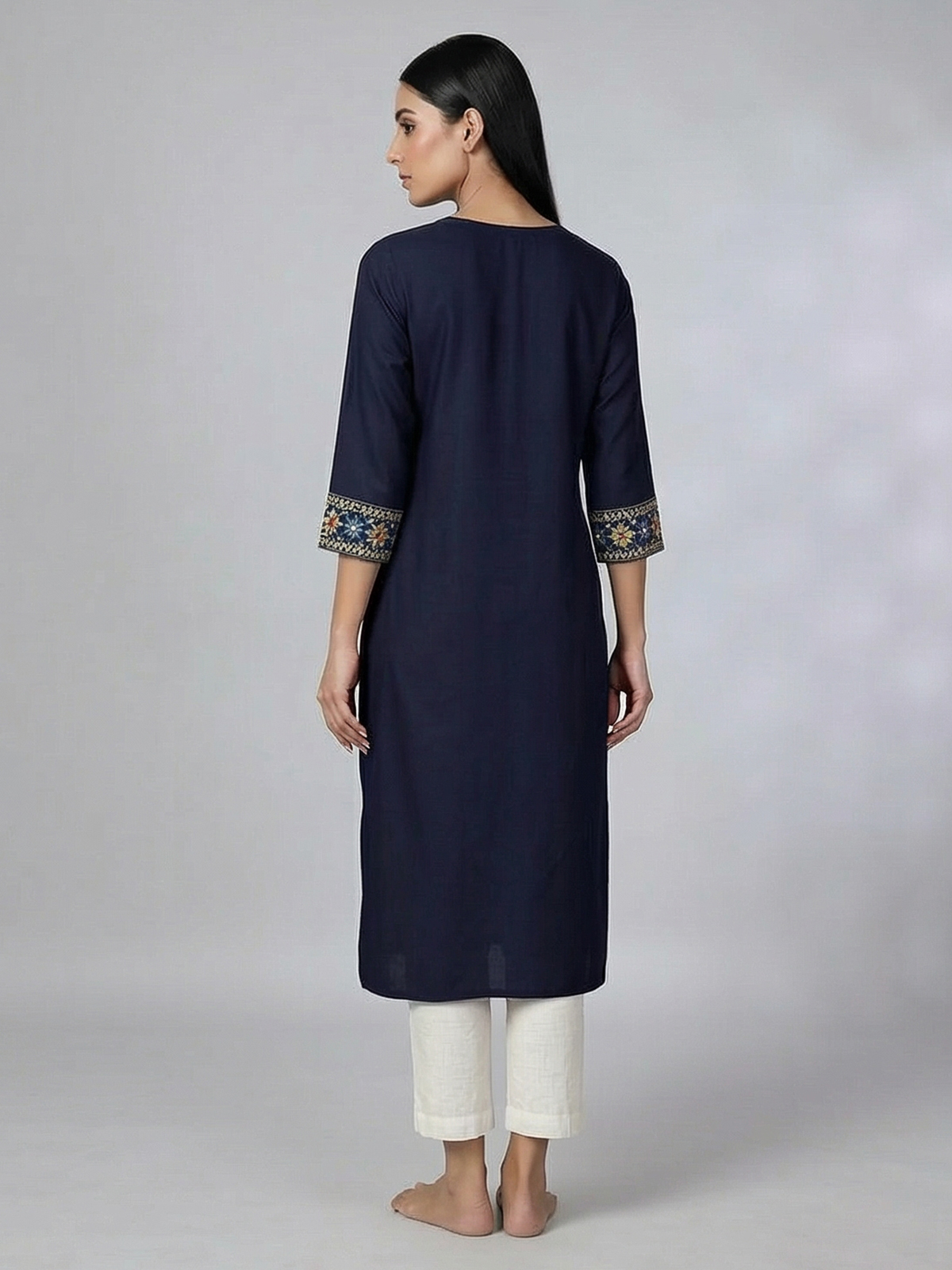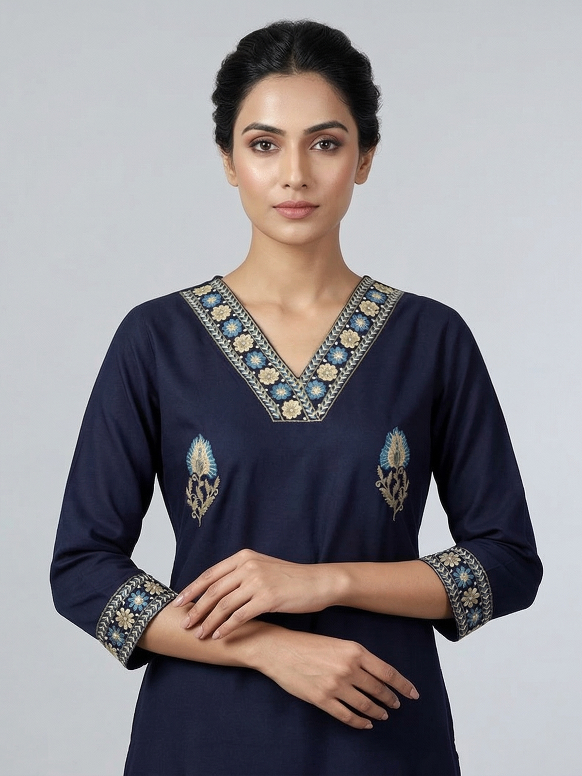 Classic navy blue cotton silk kurti is enriched with delicate embroidery that highlights its graceful appeal. The V neckline and quarter sleeves provide a comfortable yet stylish fit. Perfect for daily wear, work settings and casual outings, this kurti blends timeless elegance with modern ease.