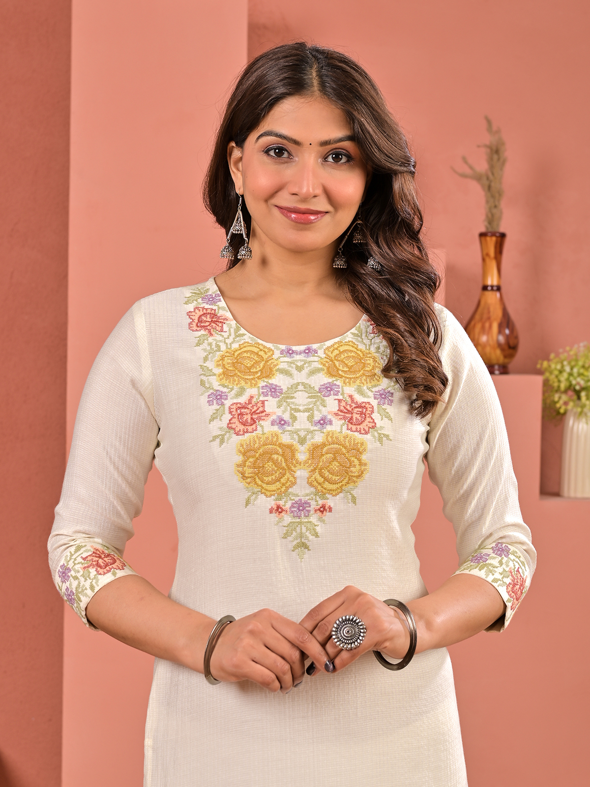 Elegant off white tones define this silk kurti crafted for refined everyday wear. Enhanced with subtle embroidery, it reflects understated beauty. The round neckline and quarter sleeves create a comfortable silhouette. Styled for casual occasions. This kurti offers a clean and graceful ethnic appeal.