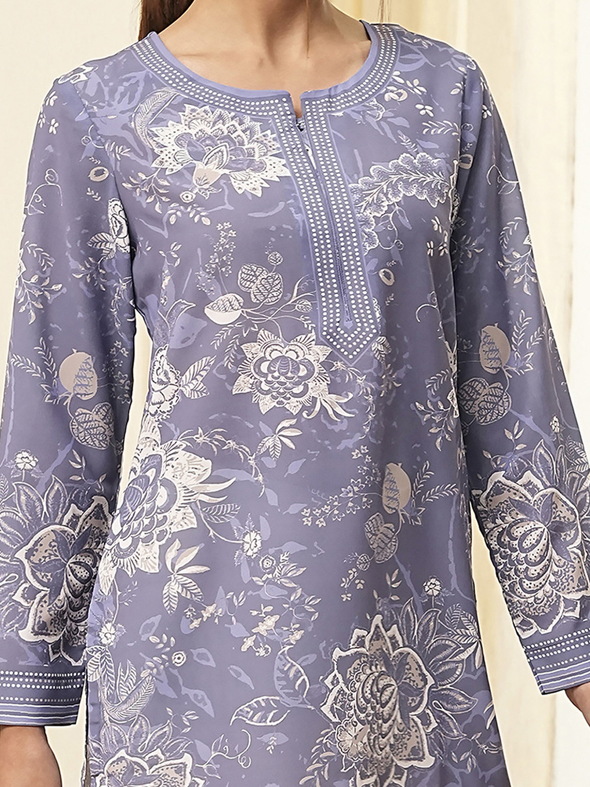 Stay effortlessly stylish in this old lavender cotton kurti, featuring a soft printed pattern, round neck, and quarter sleeves. Perfect for a relaxed yet refined everyday look.