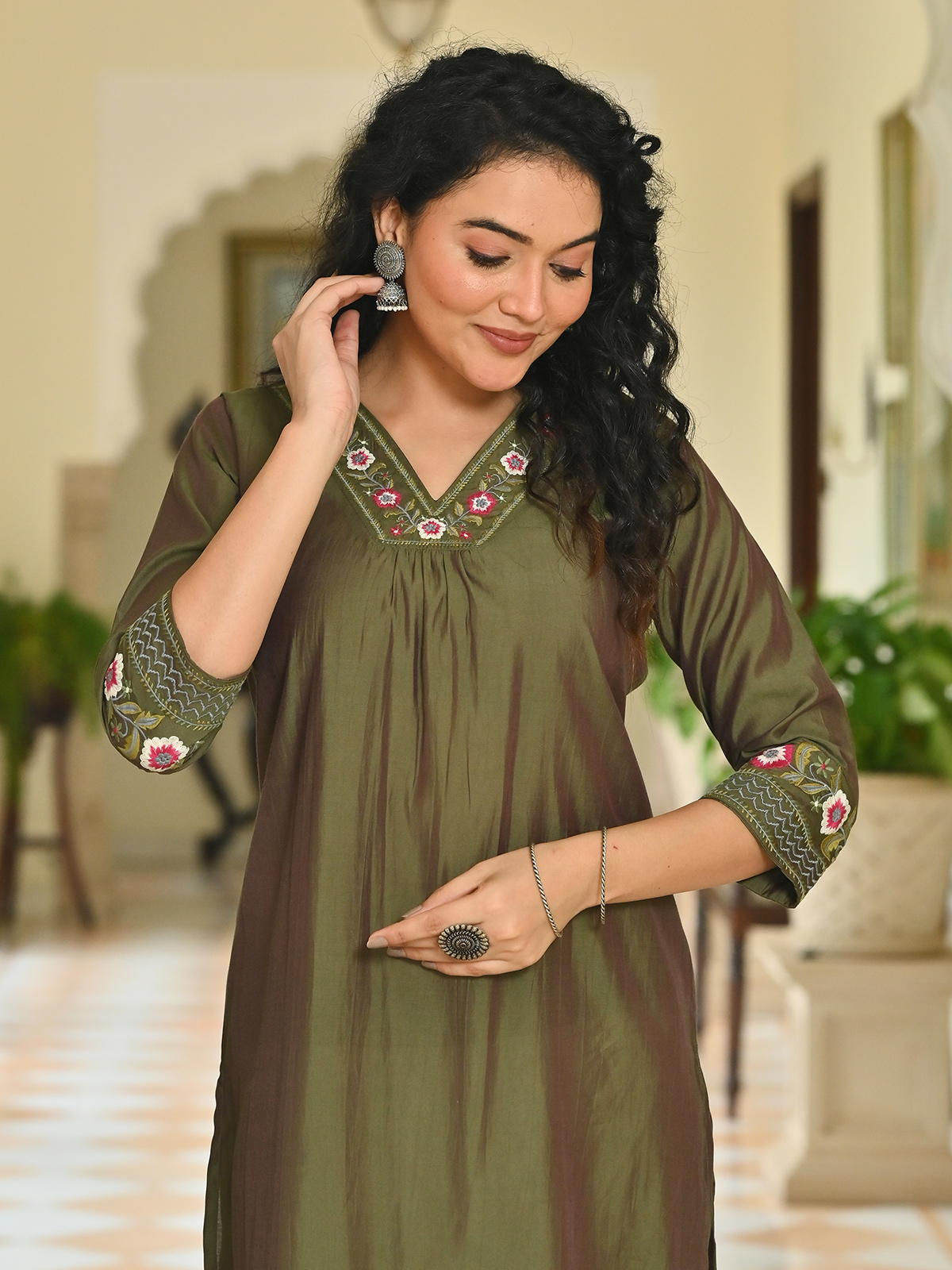 Crafted in olive cotton silk, this kurti radiates charm with delicate embroidery. Styled with a V neckline and quarter sleeves, it offers a soft, refined appeal — ideal for relaxed festive occasions or effortless everyday grace.