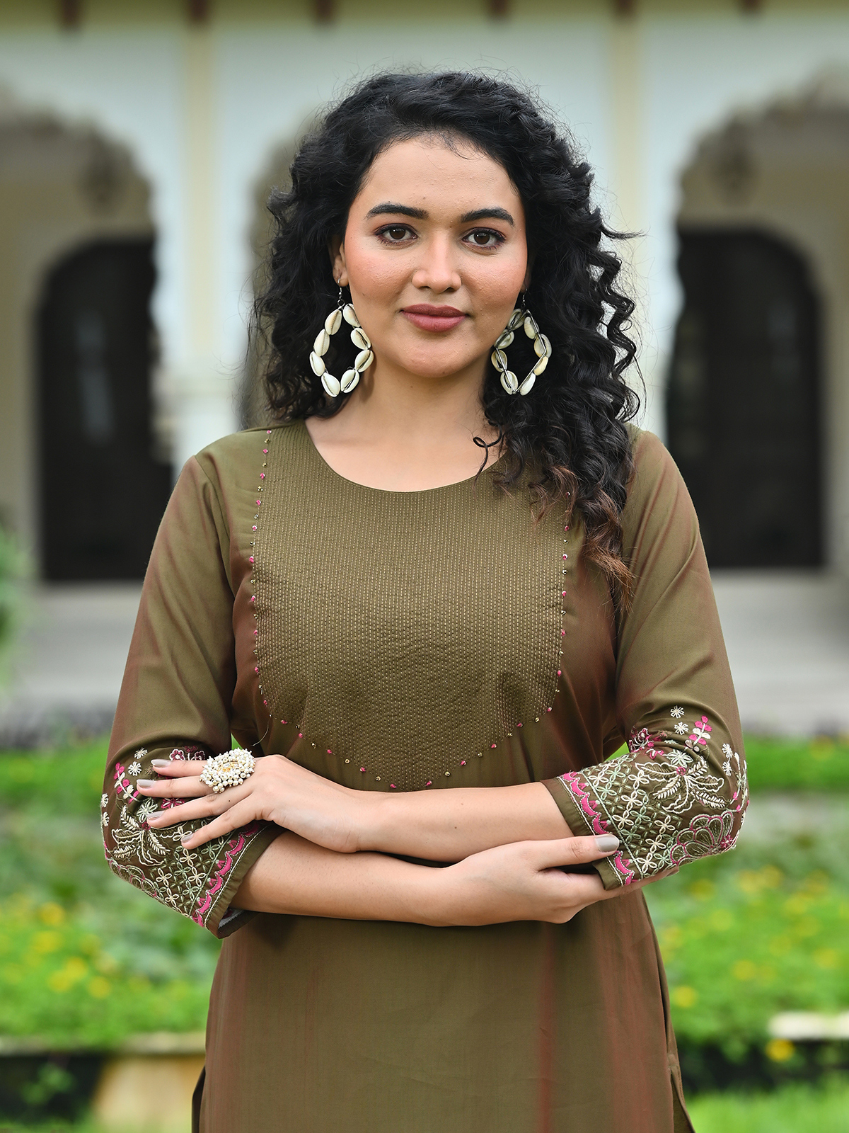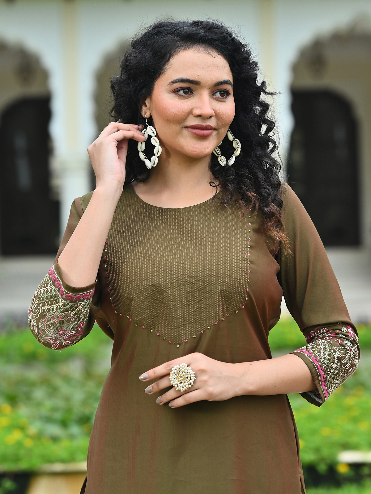 This olive cotton silk kurti features delicate embroidery, sequins, thread, and beads embellishments for a rich yet casual appeal. The round-neck design with quarter sleeves offers a flattering silhouette. Ideal for day-to-day wear or informal festive occasions, it combines modern comfort with timeless handcrafted detailing for a graceful ethnic look.