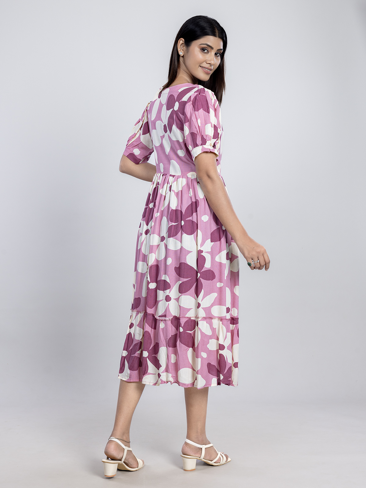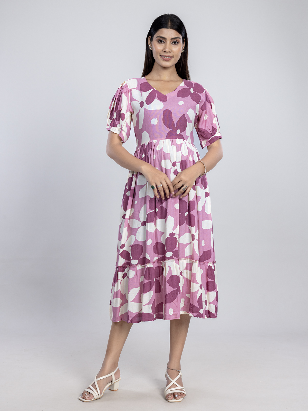 A onion pink cotton printed kurti styled with a V neckline and quarter sleeves. Fresh and vibrant, it is ideal for casual days or weekend wear. The light fabric and simple cut promise effortless ease.