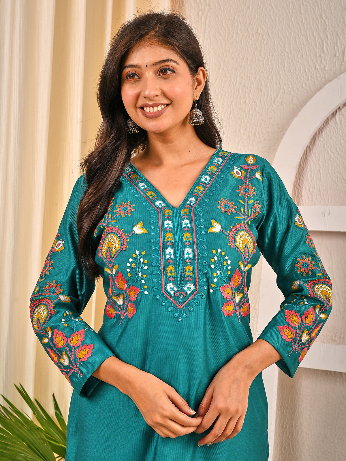 Pastel Aqua Silk V Neck Embroidered Kurti