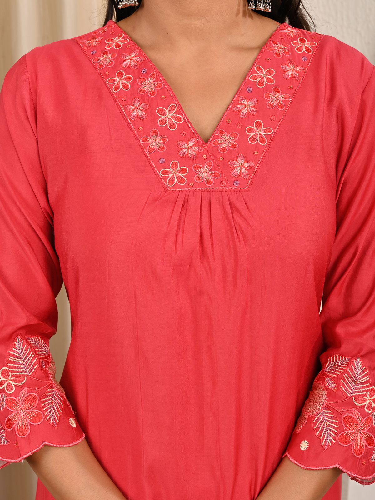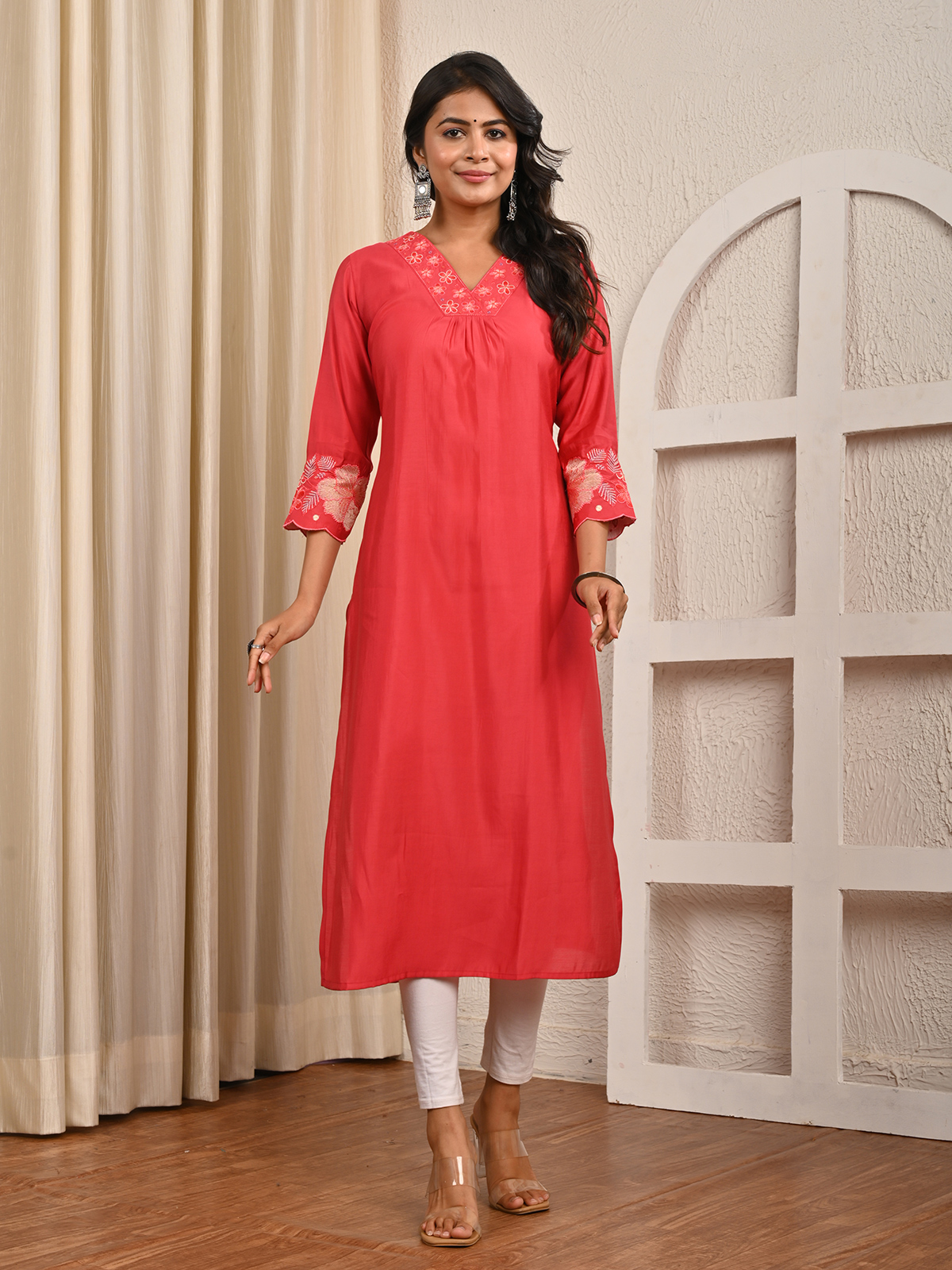 This pink cotton silk kurti sparkles with thread and sequins work, styled with a feminine V neckline and quarter sleeves. Comfortable and chic, it is perfect for casual wear, offering an elegant ethnic touch for everyday dressing.