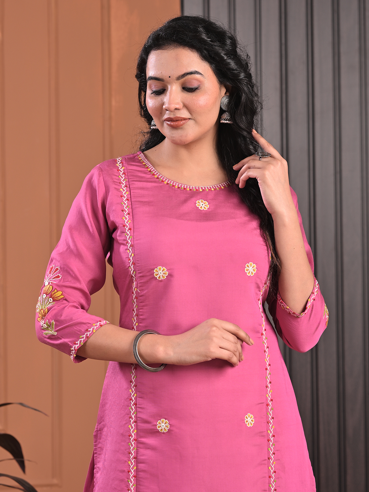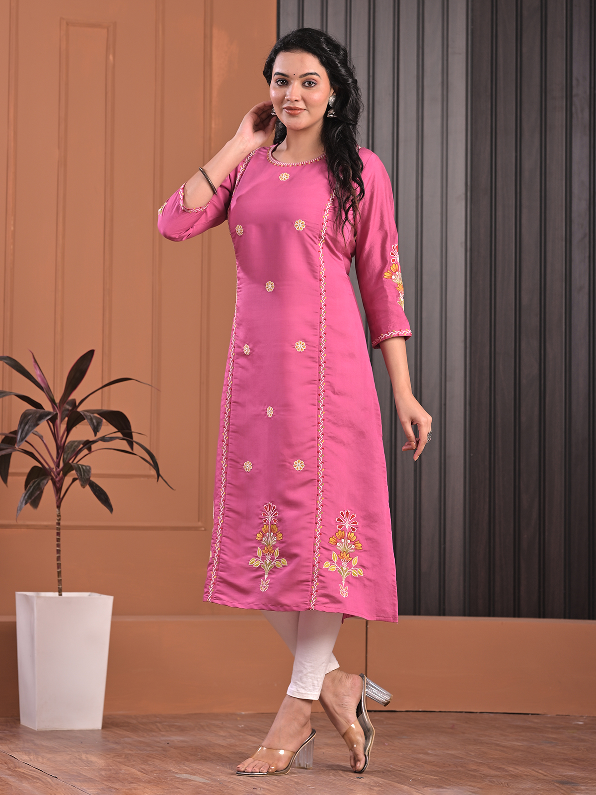 Soft pink highlight the feminine charm of this silk kurti designed for casual styling. Adorned with delicate embroidery work. It adds graceful detail. The round neckline and quarter sleeves ensure comfort and ease. Perfect for everyday wear. This kurti offers a simple yet elegant ethnic look.