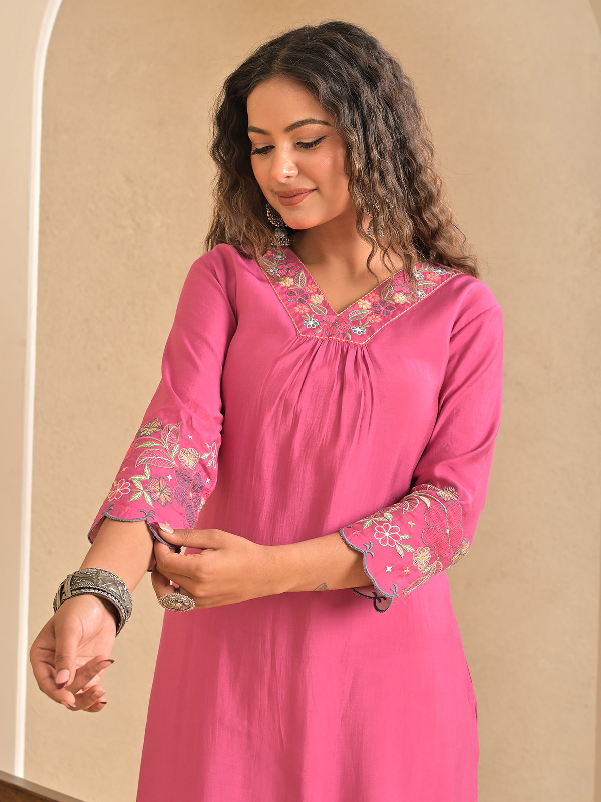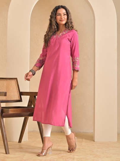 Soft pink bring feminine charm to this silk kurti crafted for everyday elegance. Adorned with intricate embroidery, it adds graceful detail. The V neckline and quarter sleeves enhance its delicate appeal. Designed in a straight cut silhouette. This kurti is ideal for casual outings and relaxed styling.