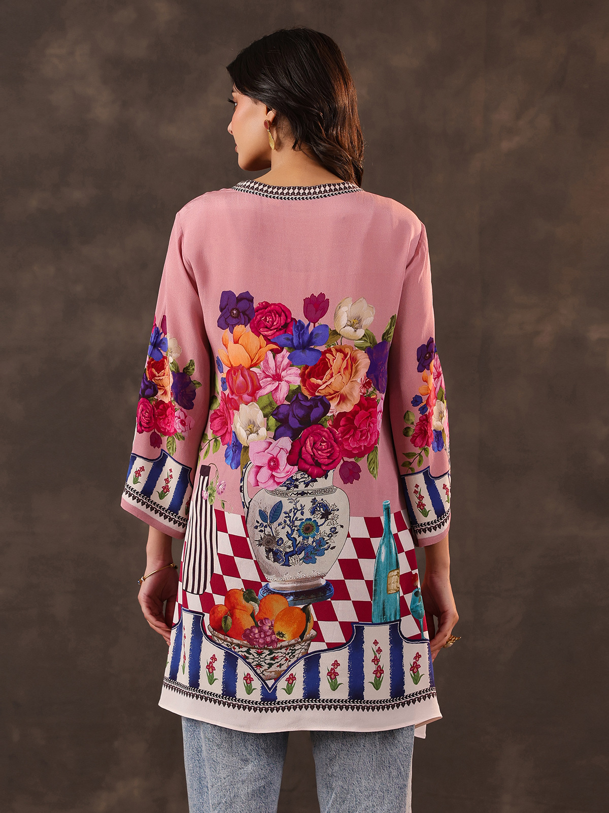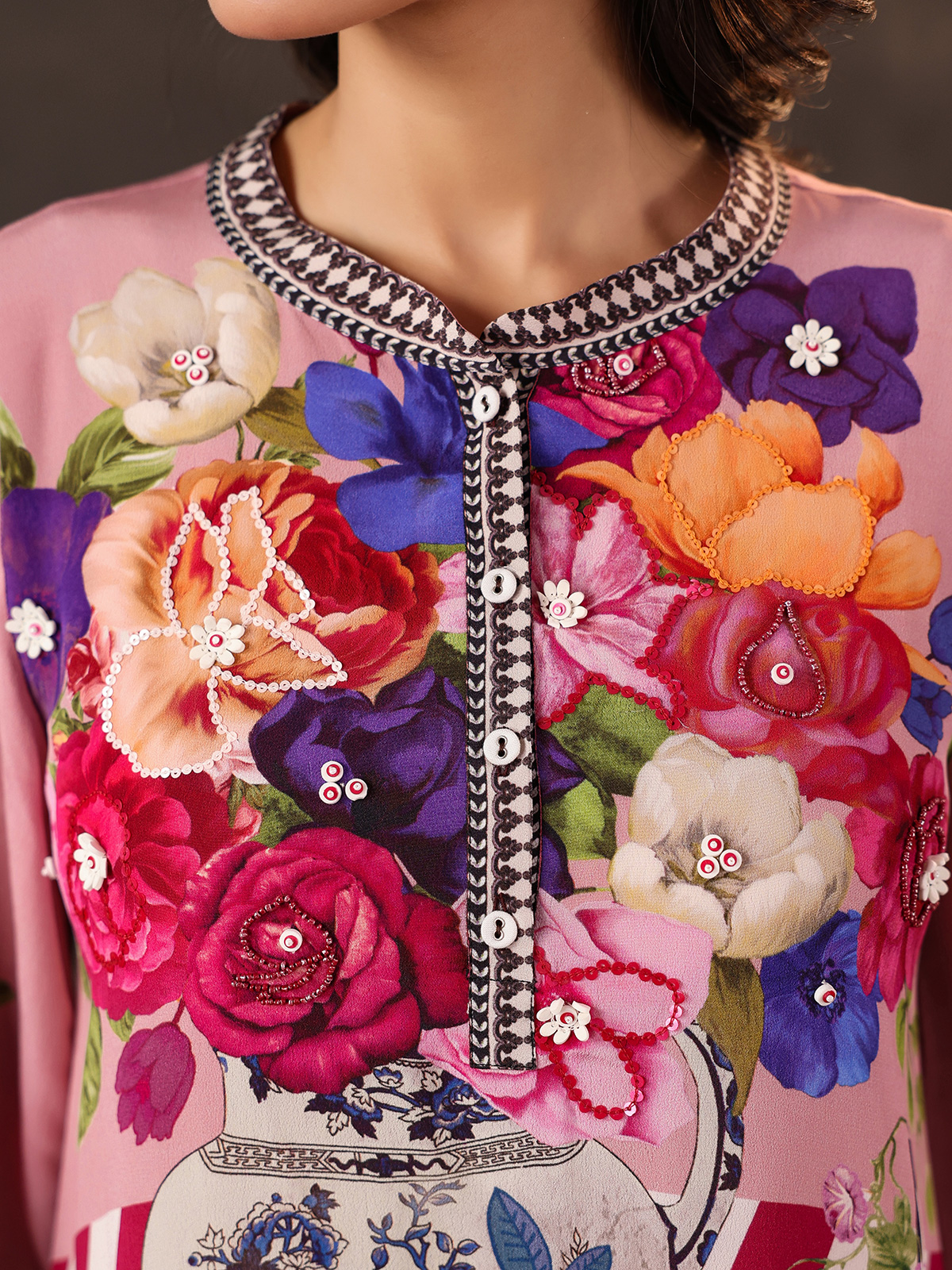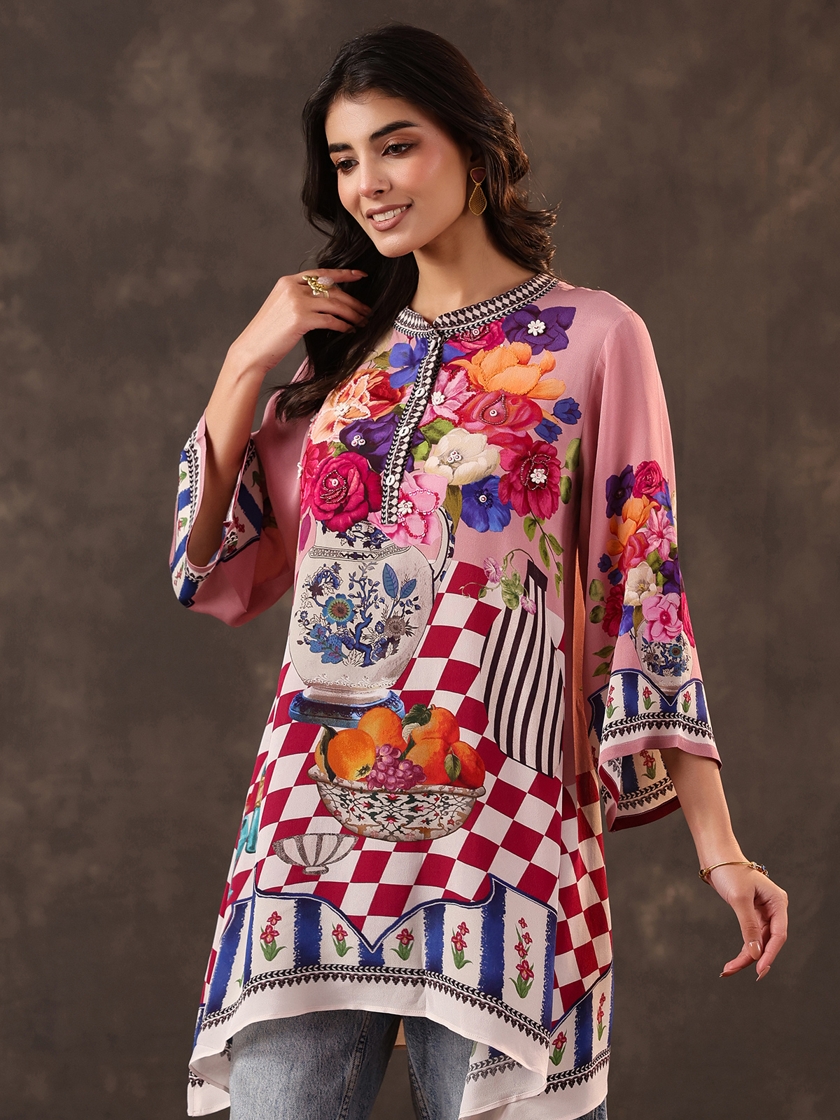 Charming pink tones bring lively elegance to this viscose crepe printed short kurti crafted for casual comfort. Designed with a refined stand collar and stylish quarter sleeves, the kurti is enhanced with delicate bead and sequin detailing that adds a hint of sparkle. The lightweight fabric and modern silhouette make it a perfect choice for casual outings and relaxed daytime gatherings.