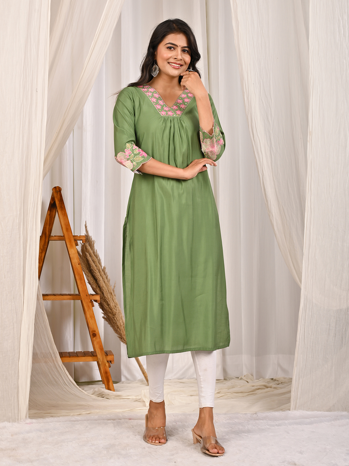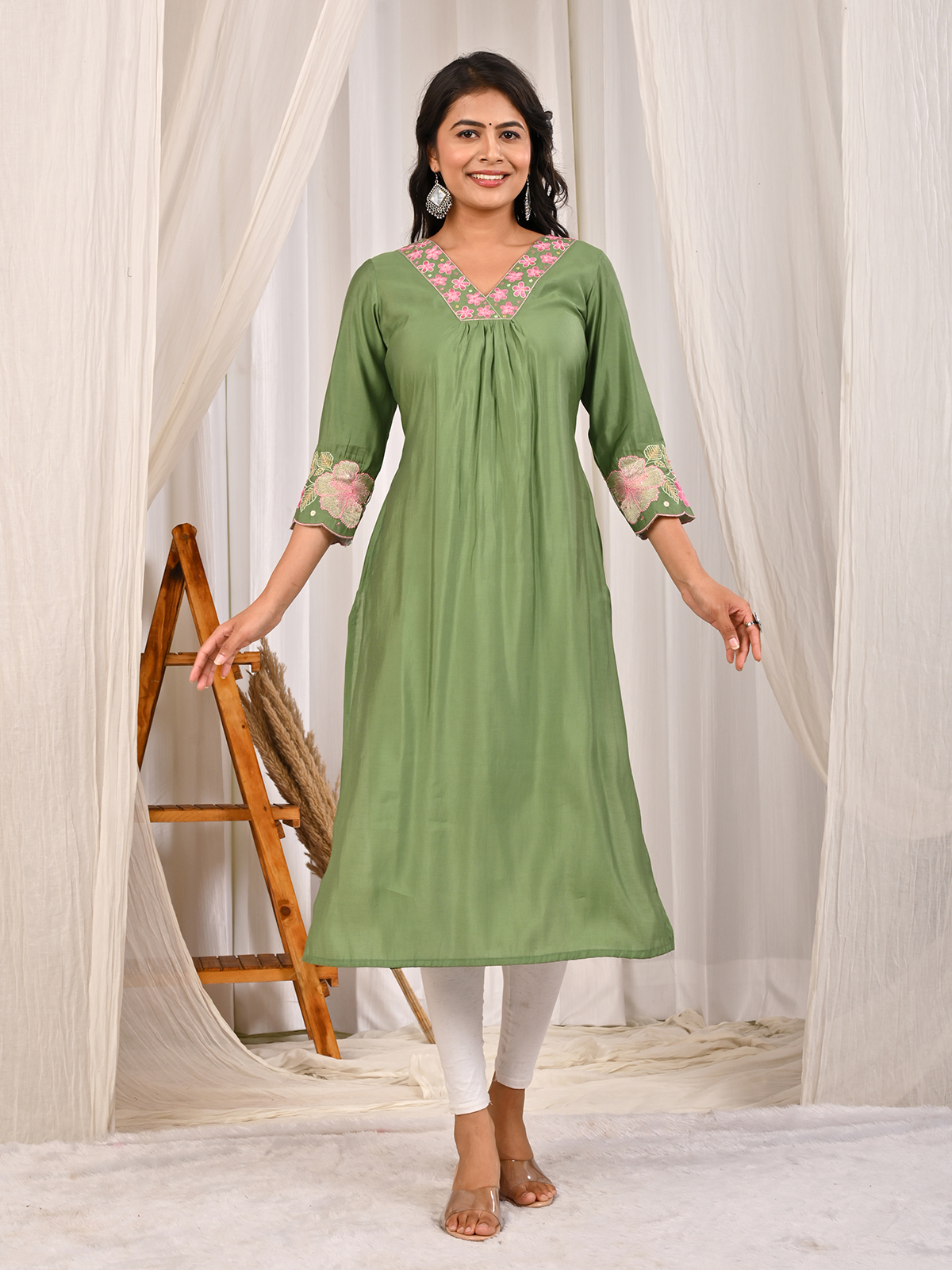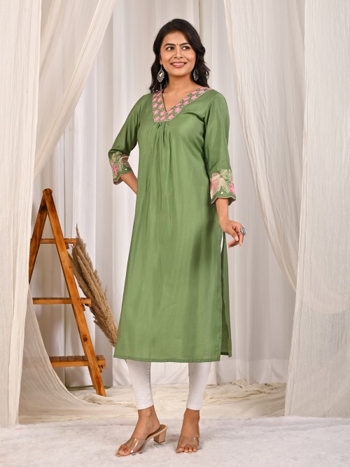 In refreshing pista green cotton silk, this kurti features thread and sequins detailing. With its V neckline and quarter sleeves, it is a stylish pick for casual outings, adding subtle elegance to relaxed ethnic fashion.