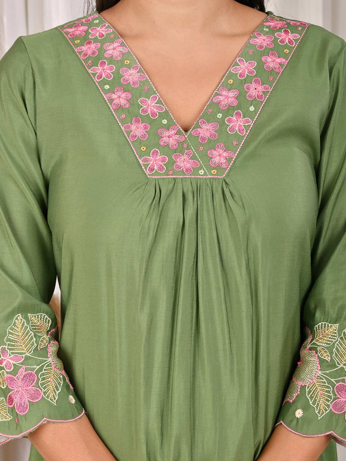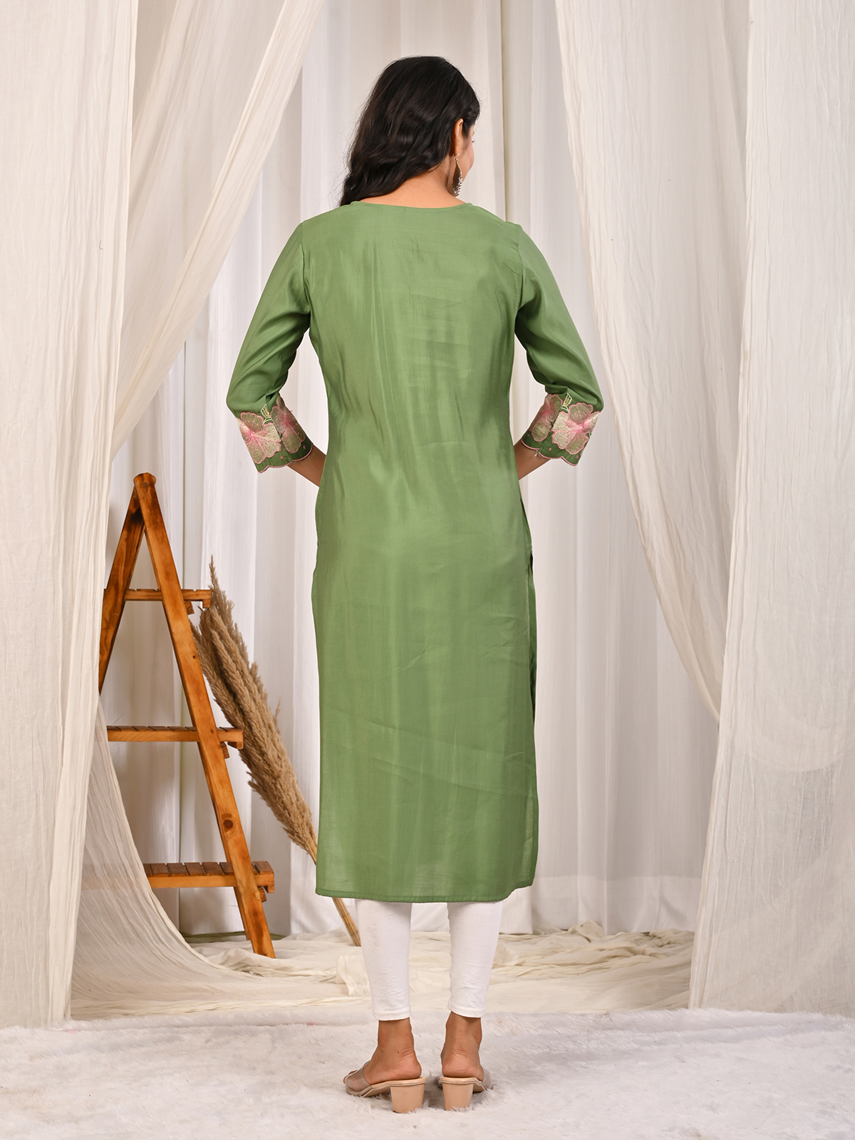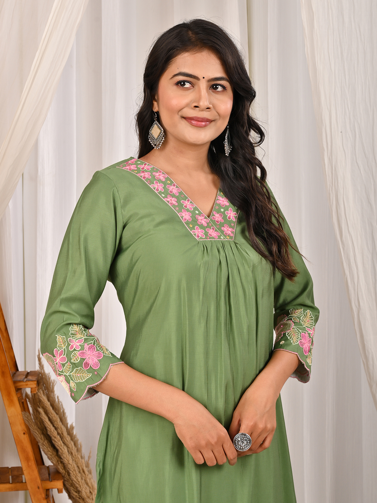 In refreshing pista green cotton silk, this kurti features thread and sequins detailing. With its V neckline and quarter sleeves, it is a stylish pick for casual outings, adding subtle elegance to relaxed ethnic fashion.